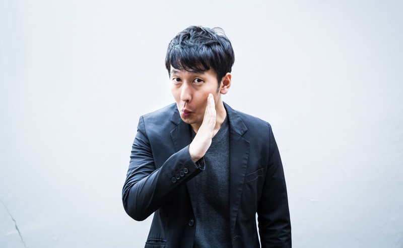 片手を頬に当てて照れる黒いスーツの短髪男性の写真素材です。黒いスーツの短髪男性が片手を頬に当てています。白とグレーのグラデーション背景のスタジオ撮影です。コミカルやリアクション素材におすすめです。