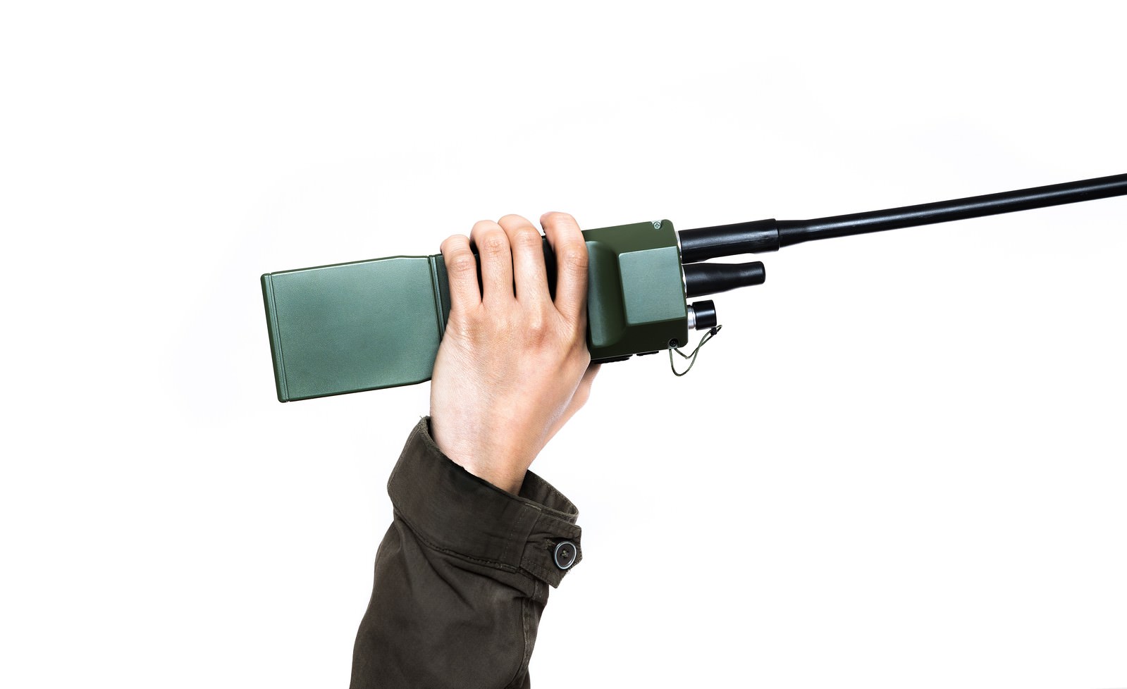 手で銃型の無線機器を掲げている写真素材です。緑の本体に複数のアンテナが伸びた、ドローンガンのような装置を片手で持ち上げています。セキュリティ・通信・ドローン対策に関する記事やサイトにおすすめです。