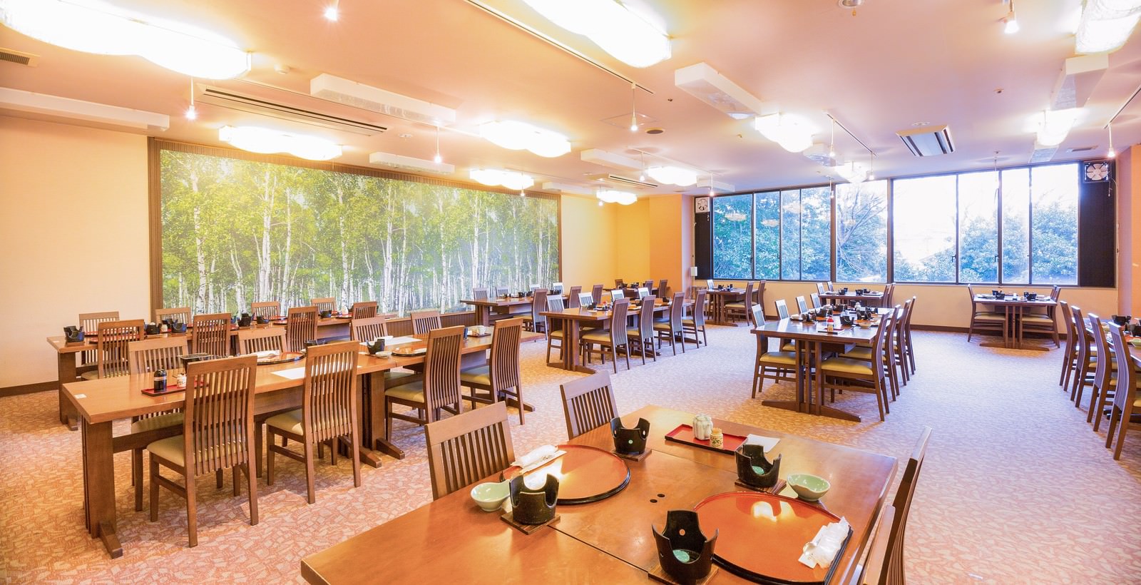 大きな窓から光が入る食事会場の写真素材です。木製テーブルと椅子が並び、各テーブルに急須と小皿がセットされています。旅館やホテルの食事シーン素材に使えます。