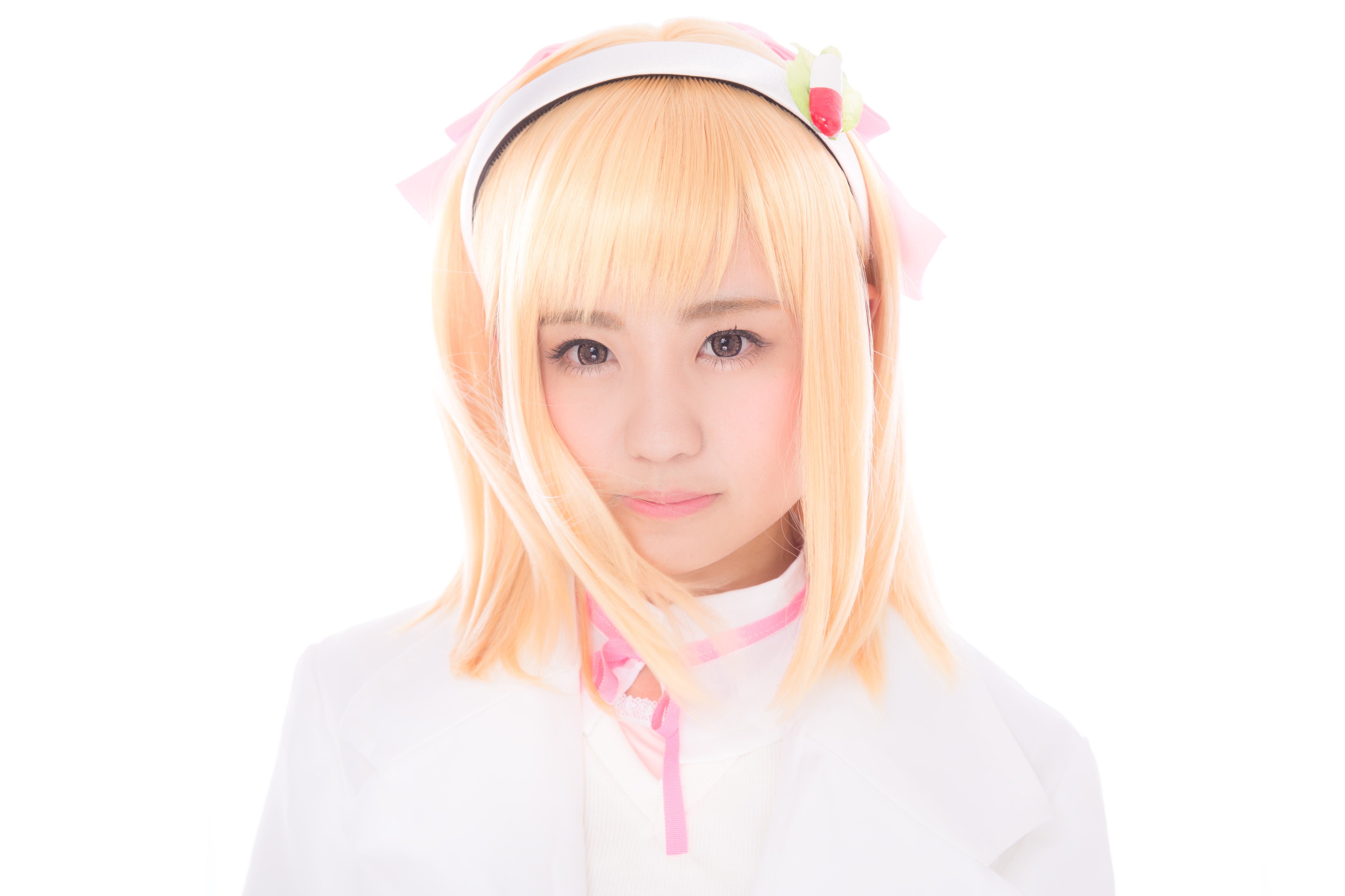 薬剤師少女のコスプレをした女性の写真素材です。金髪ウィッグといちご飾りのカチューシャが目を引くアニメキャラ風の衣装を着けています。コスプレ・アニメ・ゲーム関連のコンテンツにおすすめです。