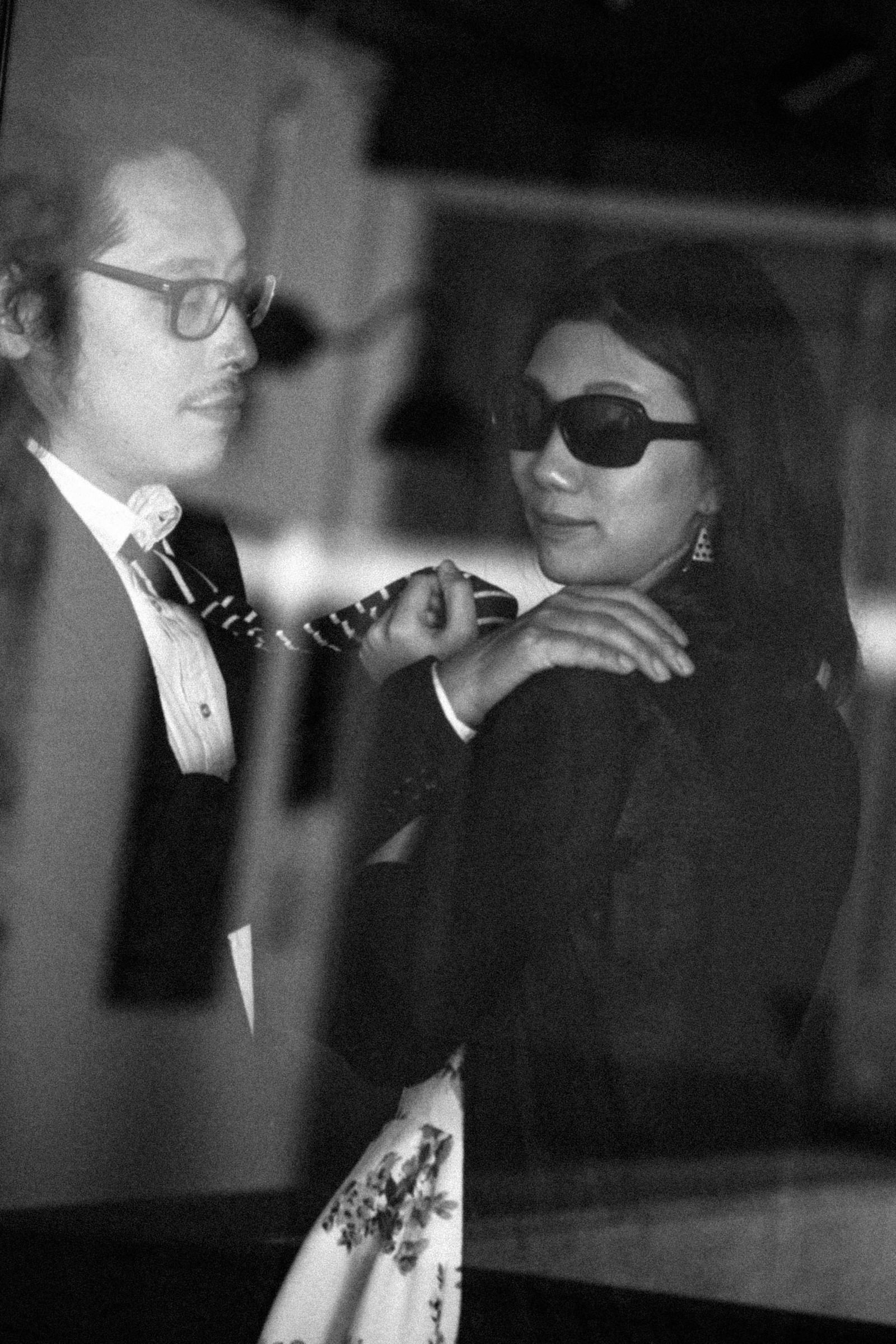 就業後の会議室での男女の密会シーンの写真素材です。黒縁眼鏡をかけた男性とサングラスをかけた女性が、室内で身を寄せて向き合っており、女性が男性の腕に手を置いています。オフィスラブやスクープ画像、スキャンダル関連のコンテンツやデザイン素材として活用できます。