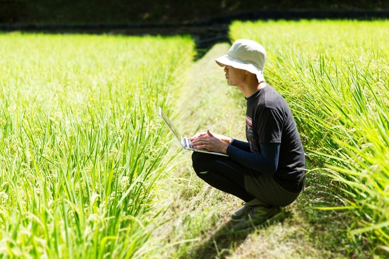 田んぼの中でノートパソコンを持って作業するノマドワーカーの写真素材です。白い帽子をかぶった男性が稲の成長する田んぼのあぜ道に腰を落とし、両手でパソコンを操作しており、背景には広がる田んぼと遠くの畔が見えています。リモートワーク、ワーケーション、田舎での仕事、自由な働き方などのコンテンツに活用できます。