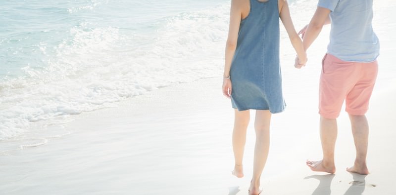 彼氏と彼女が波打ち際で手をつなぐ写真素材です。青いワンピース姿の女性とピンクのショーツにブルーのシャツを着た男性が、白い波が打ち寄せる浜辺に並んで立ち、手を繋いでいます。デートやカップル素材、夏の海での思い出表現、旅行やライフスタイル関連のコンテンツにおすすめです。