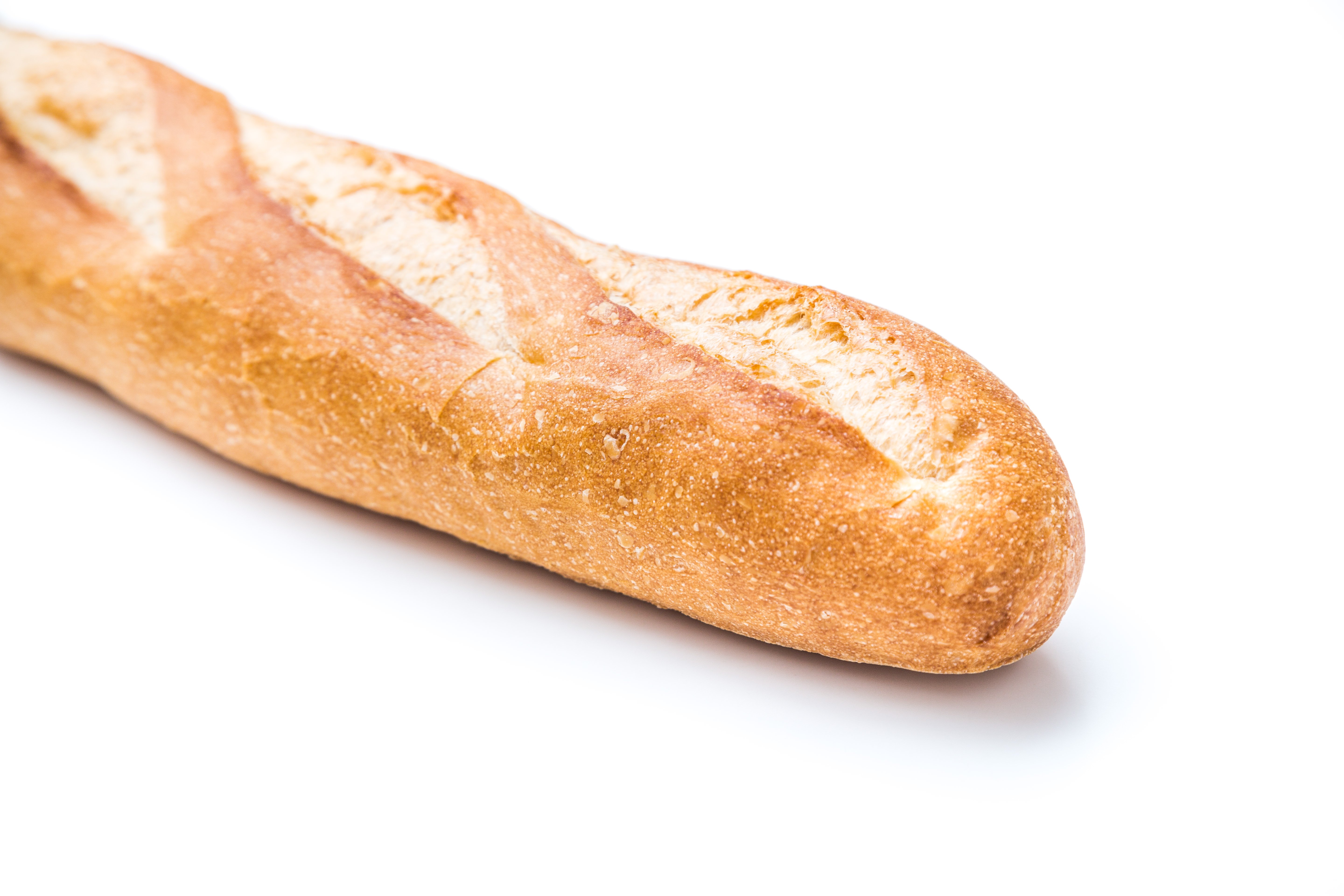 白い台の上に斜めに置かれたフランスパンの写真素材です。斜めの切れ目が入った外皮に茶色から黄土色の焼き色がついています。パン屋の紹介やベーカリー関連、朝食やグルメ系コンテンツなどにおすすめです。