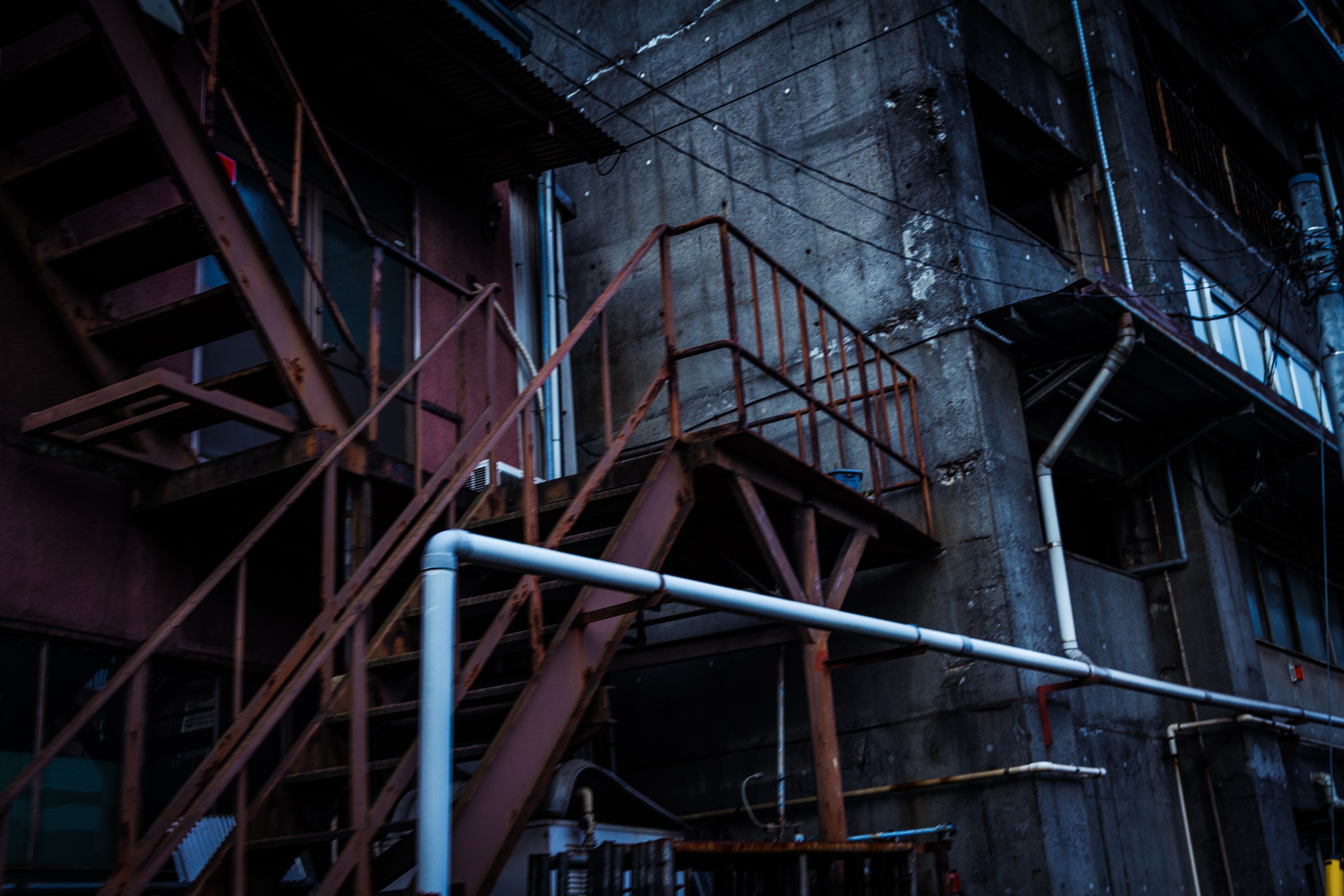 年期の入った工場の夜間風景の写真素材です。赤錆びた鉄骨の階段と手すり、灰色のコンクリート壁の汚れ、複数の配管やケーブルが張り巡らされた不気味な産業施設の風景を捉えています。ダークなテーマのコンテンツ制作や工業地帯の背景素材に最適です。