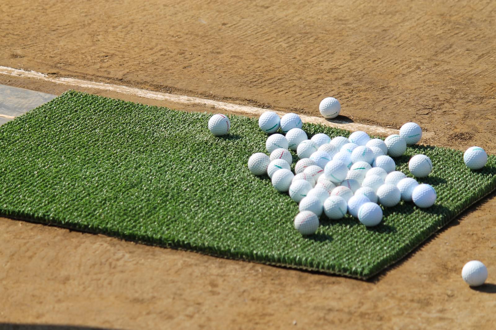 打ちっぱなしのゴルフ練習場に置かれたゴルフボールの写真素材です。緑の人工芝の上に白いゴルフボールが複数個集められ、手前には土のエリアと白い区切りラインが見えており、ゴルフスイング練習の準備風景が捉えられています。ゴルフ関連の記事やスポーツ施設の紹介に活用できます。