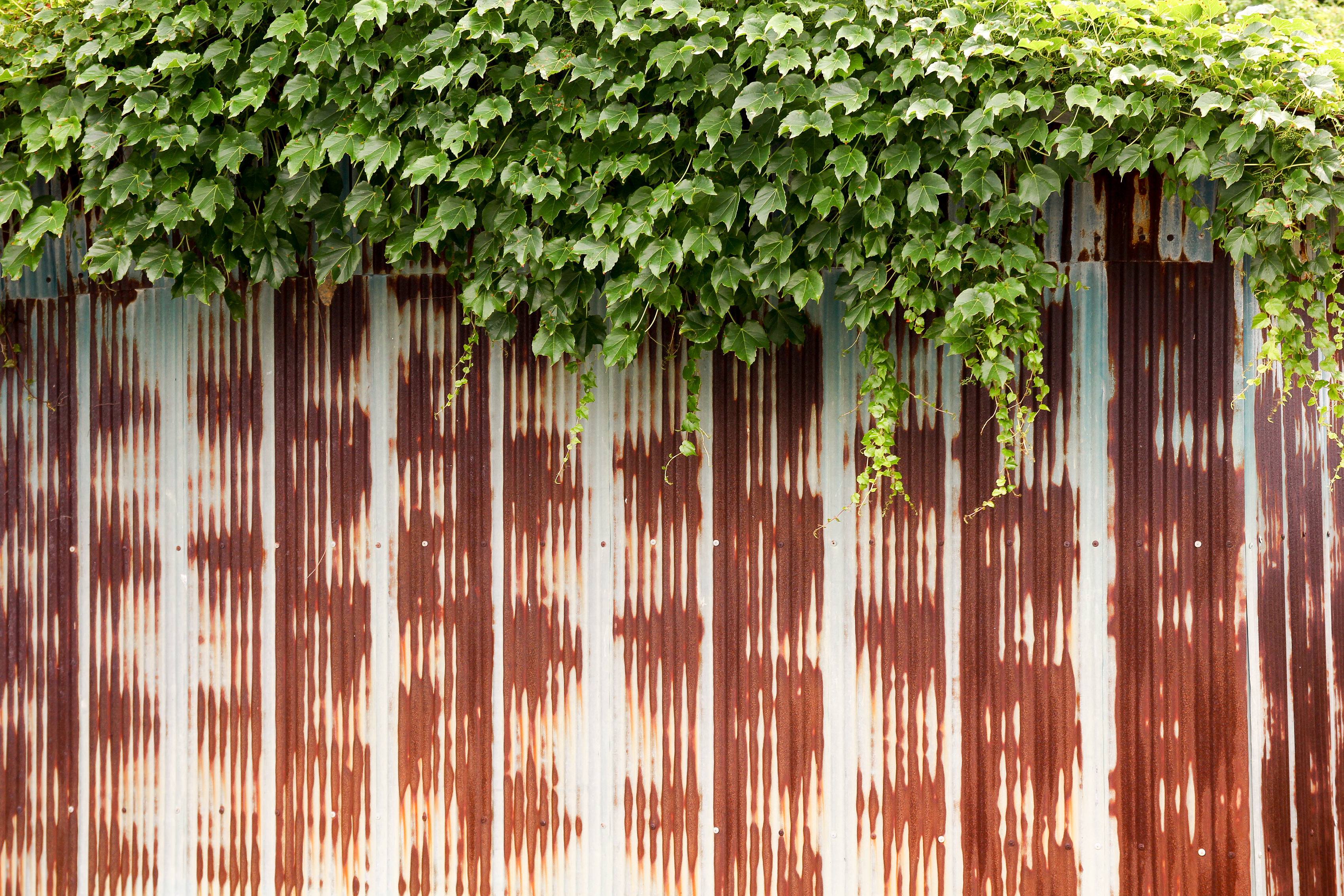 屋外の金属製波板フェンスを蔦が覆っている写真素材です。錆びて変色したトタン板の上部から濃い緑の葉が密生して垂れ下がり、自然と人工物の対比が出ている。経年変化のイメージや建築・環境関連のコンテンツ制作におすすめです。