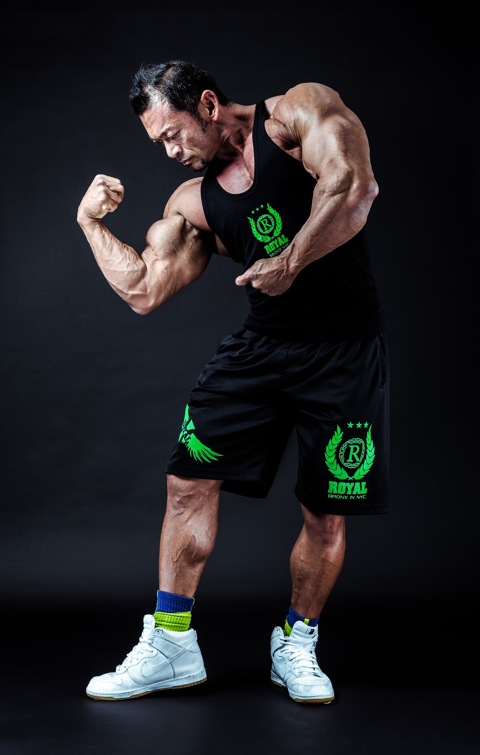 ボディビルダーが筋肉を披露するポーズの写真素材です。黒いタンクトップと短パンを着た男性が両腕を上げて二頭筋を強調し、発達した肩から腕、脚の筋肉を見せています。フィットネス関連のWebサイト、トレーニング指導、健康・筋力アップのコンテンツなどにおすすめです。