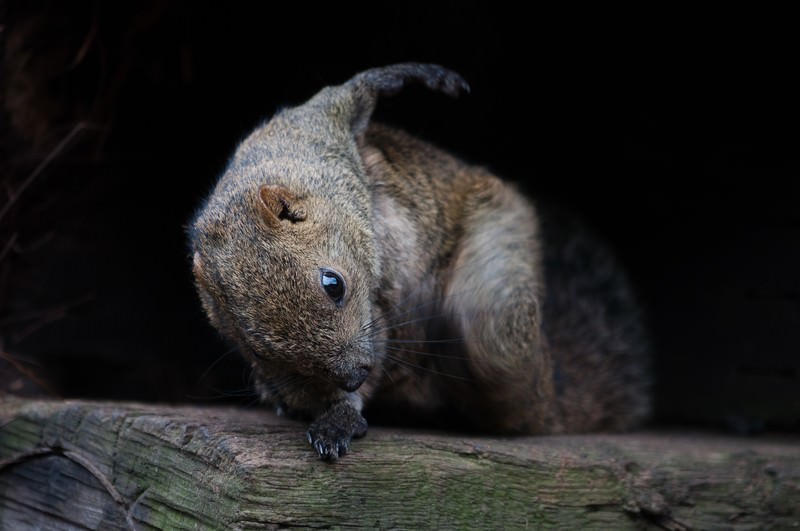 走り去るリスの写真素材です。灰色の毛並みをしたリスが朽ちた丸太の上に立ち、体を前傾させて全力で走り出そうとしています。青い瞳が前方を向き、爪が丸太をつかむ瞬間です。動物の動きのコンテンツやユーモア系の記事、野生動物の瞬間的な行動写真などにおすすめです。