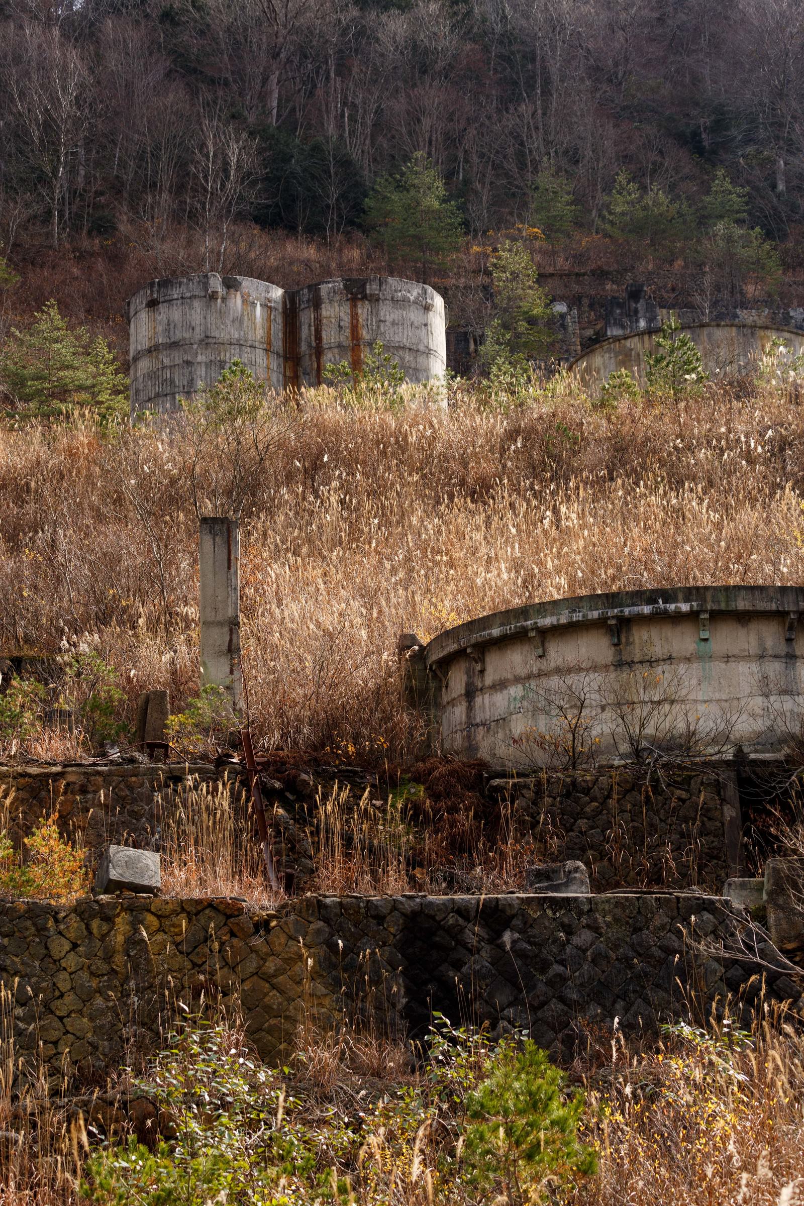 かつて採掘が行われていた土畑鉱山の廃墟の写真素材です。風化した金属製の貯蔵タンク複数基が枯れた草地に放置され、赤錆が付着した風景は背景の雑木林と相まって歴史の重みを感じさせます。産業遺産やホラー系コンテンツ、歴史関連の記事などにおすすめです。