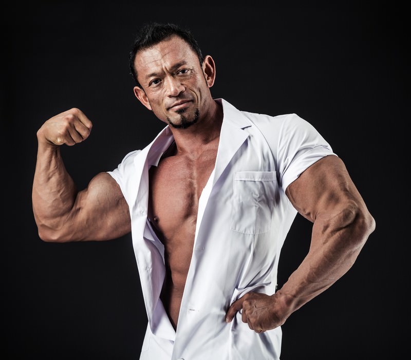 ボディビルダーが白衣を着て筋肉をアピールしている写真素材です。白い半袖シャツを半開きにした男性が、片腕の力こぶを曲げて見せており、黒い背景の前でカメラを見つめています。筋力トレーニング、ボディビル関連のコンテンツやユーモアのあるビジュアル素材として活用できます。