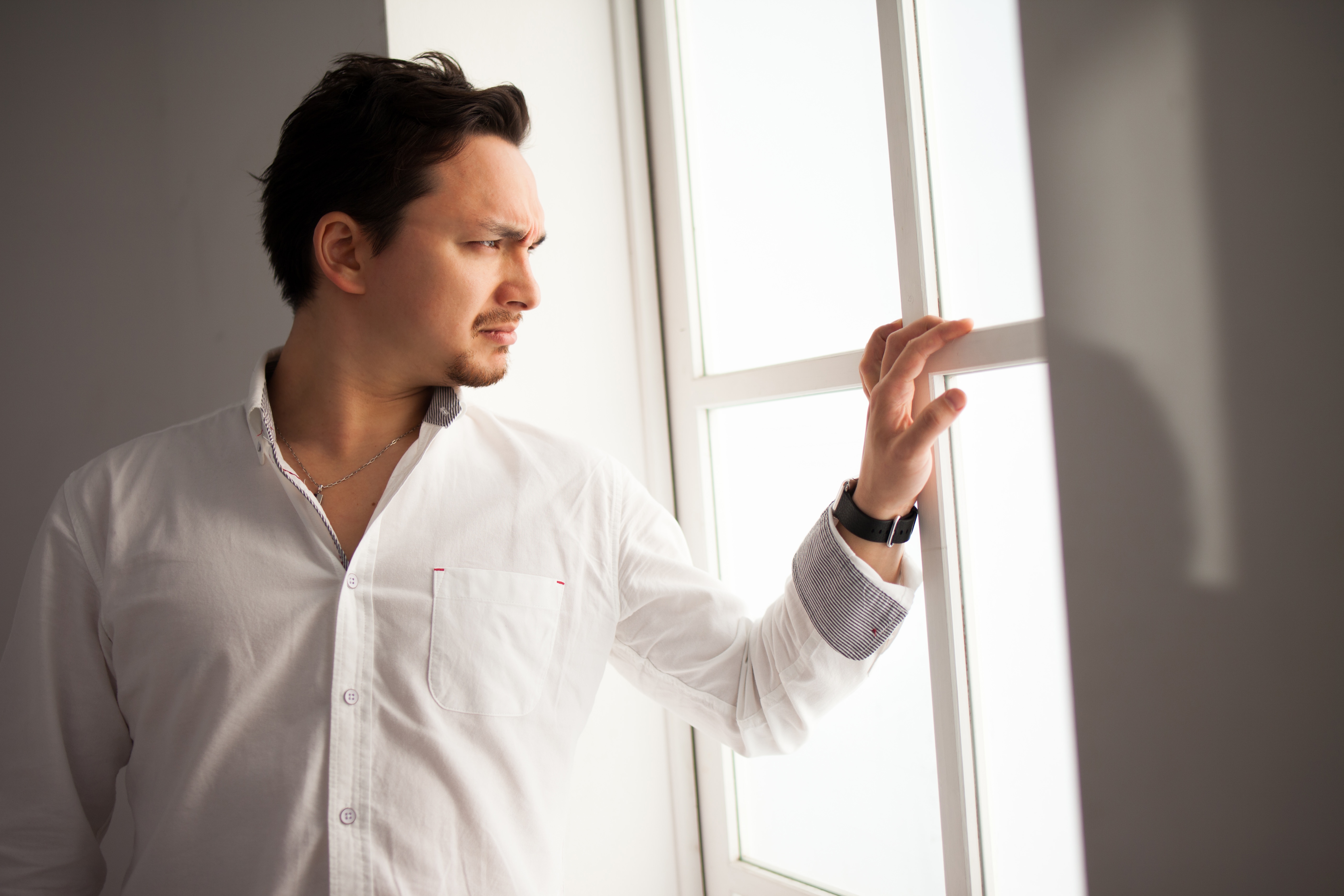 険しい表情で窓の外を見つめる男性の写真素材です。白いシャツを着た男性が室内で窓に向かい立ち、右手を窓枠に置きながら、眉をひそめた真剣な横向きの表情で窓外を警戒するように観察しています。スパイ映画やサスペンス系コンテンツ、不安感や危機感のデザイン制作などにおすすめです。