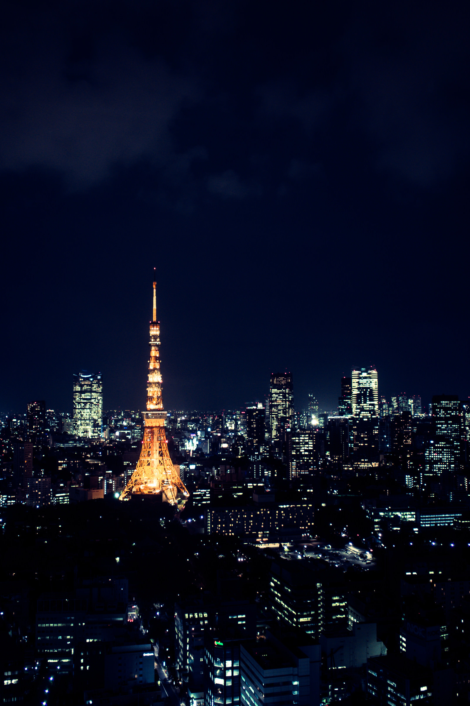 夜間にオレンジ色にライトアップされた東京タワーと都心の夜景の写真素材です。タワーの塔体が黄橙色に照らされ、周囲の高層ビルは緑色や白色に点灯しており、闇夜の中に浮かび上がった建築物が密集した都市景観が広がっています。観光地紹介や地方創生、旅行雑誌、都市開発関連のコンテンツなどに活用できます。