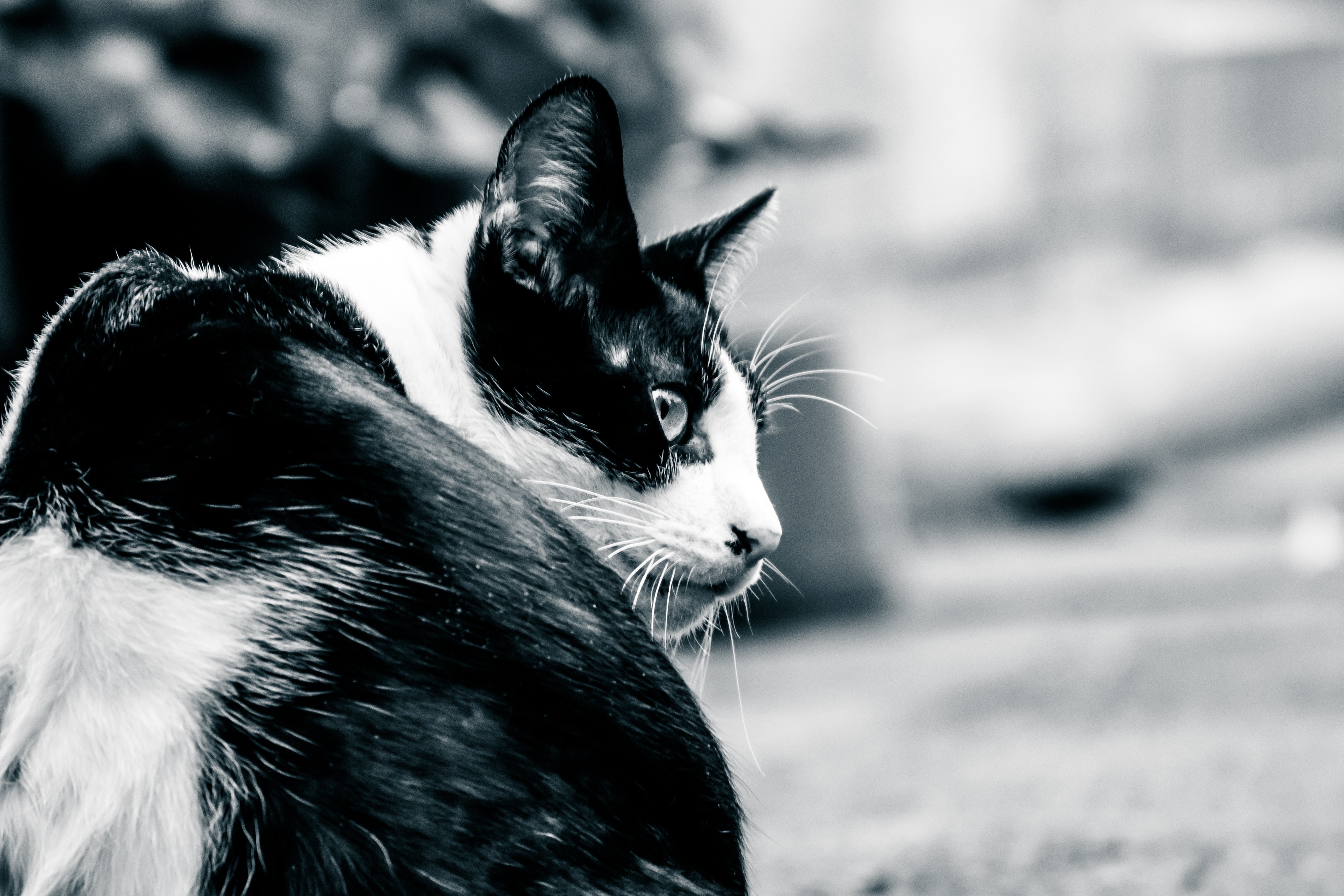 白黒のハチワレ猫を横顔から撮ったモノクロ写真素材です。猫は顔をやや前に向け、目つきが鋭く怒っているように見えます。猫コンテンツやペット関連のSNS投稿などにおすすめです。