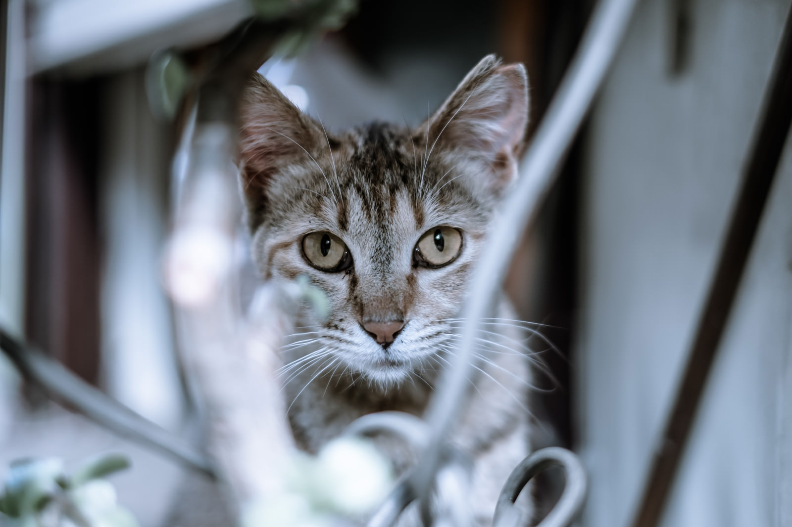 振り向いたら猫と目があった瞬間の写真素材です。キジトラの猫が黄緑色の瞳で視線を正面に向け、両耳を立てた状態で顔全体がはっきりと捉えられた一枚です。ペット関連のコンテンツや動物ブログ、猫好きメディアなどにおすすめです。
