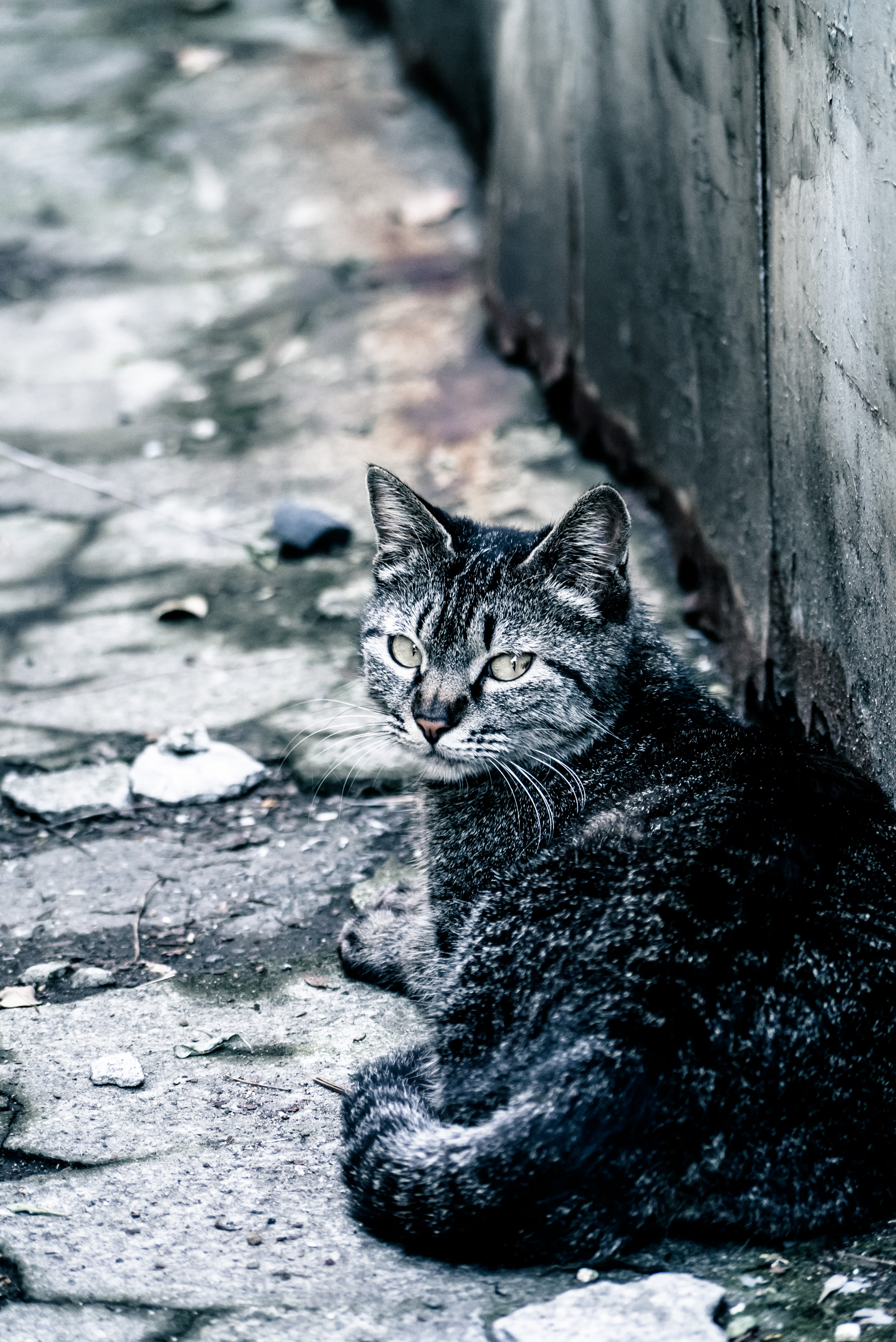 振り返る野良猫の写真素材です。キジトラ模様の猫が路地のアスファルト上に伏せた状態で振り返り、黄緑色の瞳で視線を向けている、背景にはコンクリートの塀と路面が映っており、警戒心を持つ猫の様子が表現されています。動物や野生動物のテーマ、ペット関連のウェブサイトやブログなどにおすすめです。