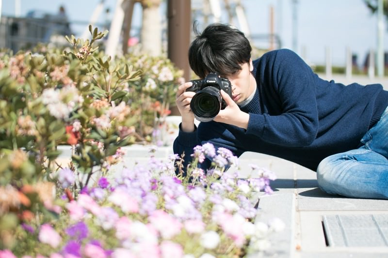寝転びながら撮影するアマチュアカメラマンの写真素材です。紺色のニット姿の男性が地面に横たわり、キャノンの一眼レフカメラを構えて花壇の花に鏡頭を向けており、背景には建築物と緑が広がっています。カメラや写真撮影、創意工夫した撮影方法などのコンテンツにおすすめです。
