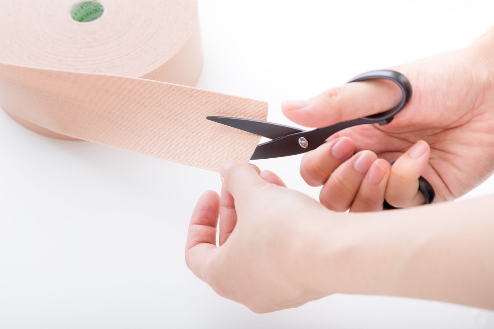 げんき堂整骨院でキネシオテープをカットしている写真素材です。黒いハサミを持つ手がベージュ色のキネシオテープを切り、患者に合わせた形状に調整する専門的なテーピング施術の様子を捉えています。整骨院の施術内容や医療関連のコンテンツ、スポーツ怪我対策などにおすすめです。