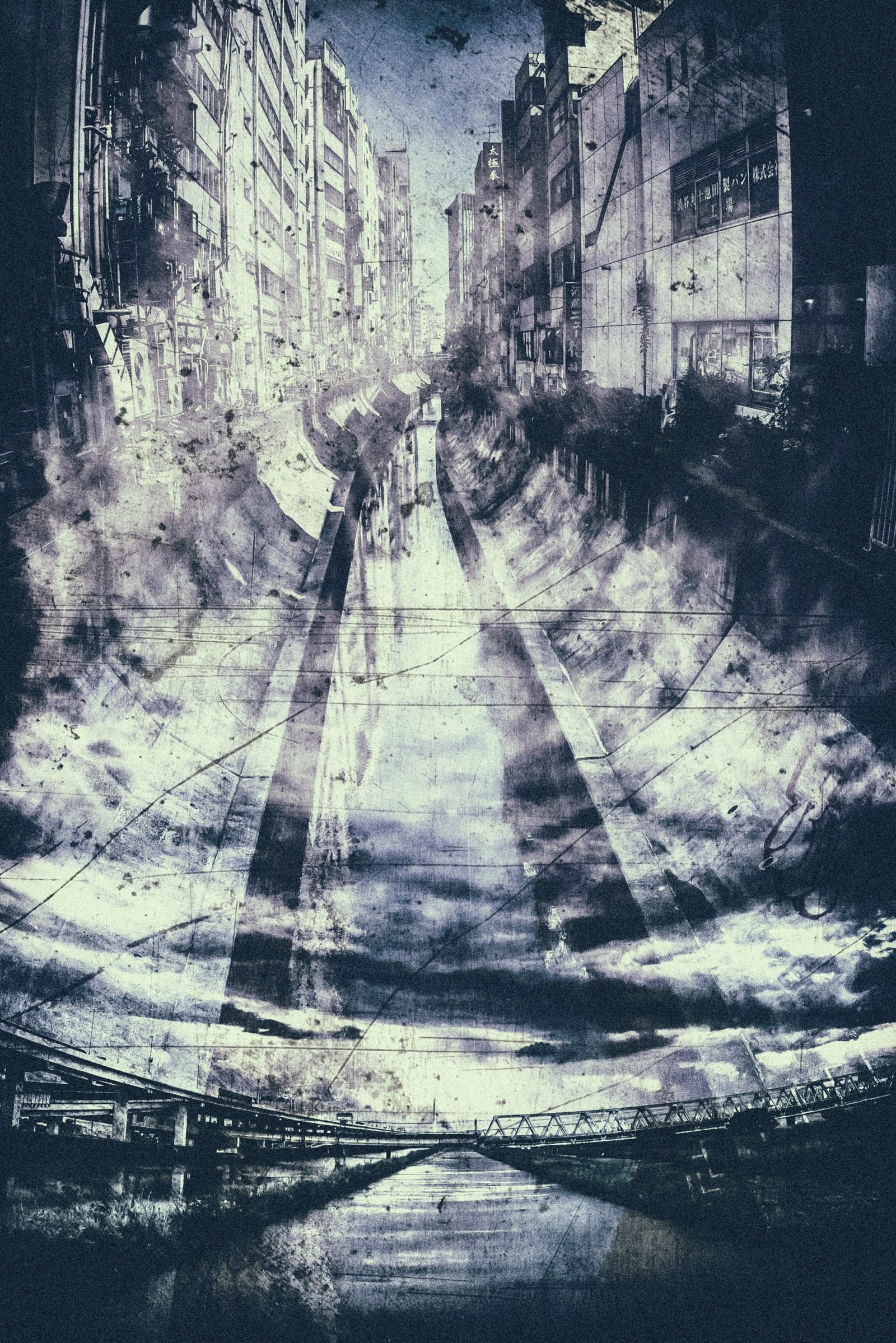 ビルに挟まれ流れる川(フォトモンタージュ)