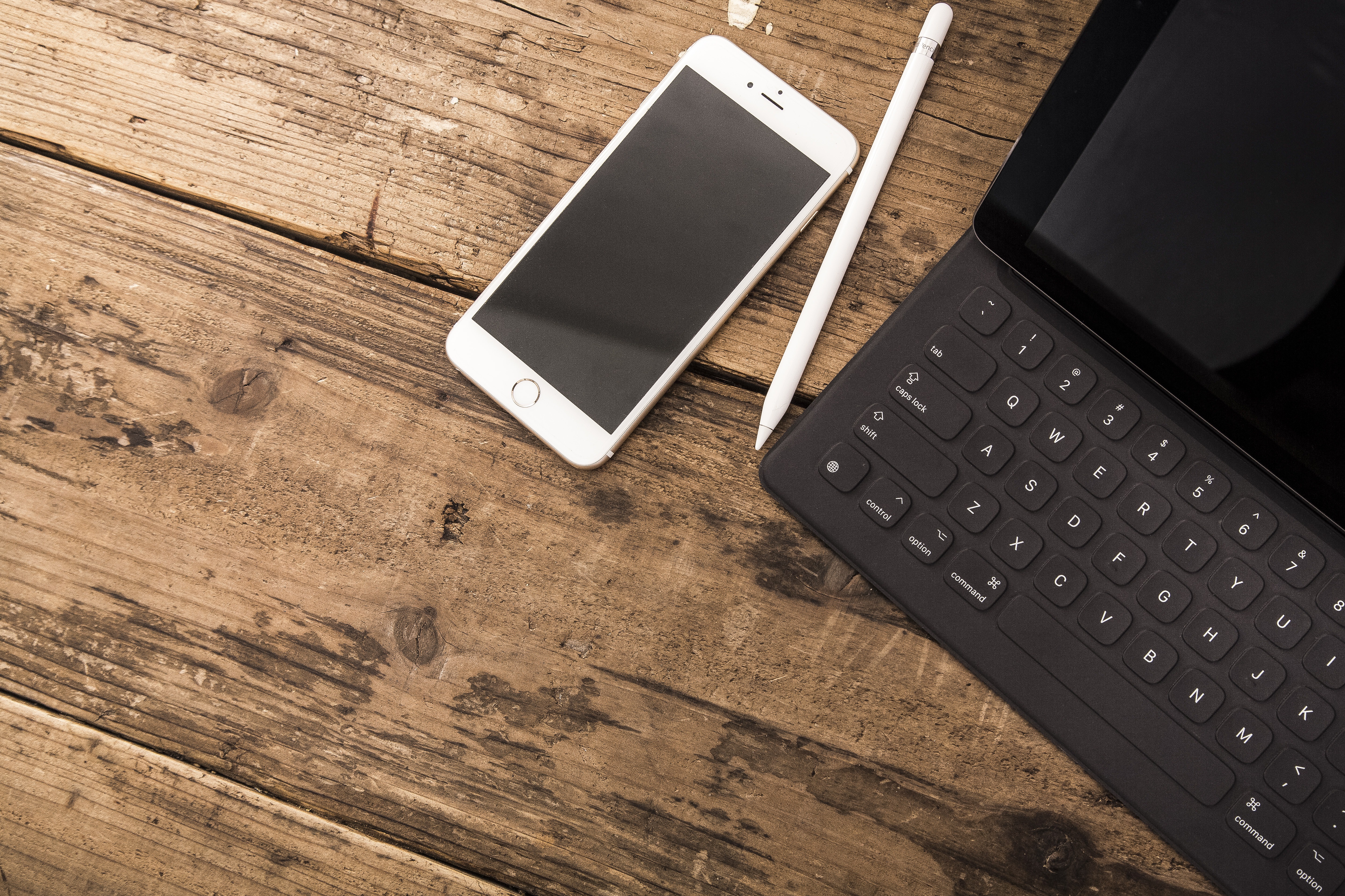 木目のテーブルにiPhoneとiPadキーボードが置いてある写真素材です。Apple Pencilが添えられ、俯瞰で撮られています。ガジェット紹介やモバイルワーク・テック系ブログ記事などにおすすめです。