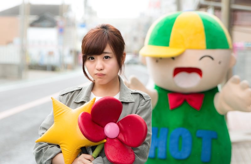Young woman playfully taking a mascot character's accessories at Ohara Central Shopping Street