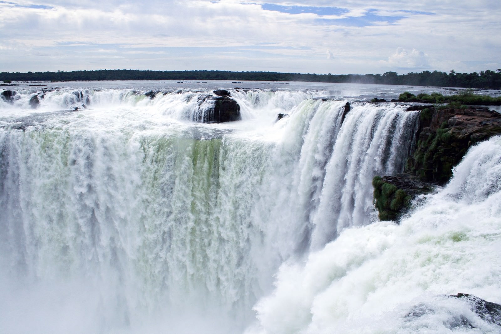ブラジルのイグアスの滝の写真素材です。ブラジル・アルゼンチン国境に位置する段状滝群を上流側から撮影しており、複数の滝が階段状に落下し、白い水流が岩盤に激しく衝突して勢いよく水しぶきを上げています。世界遺産の景観撮影や旅行ガイド、自然風景素材としておすすめです。