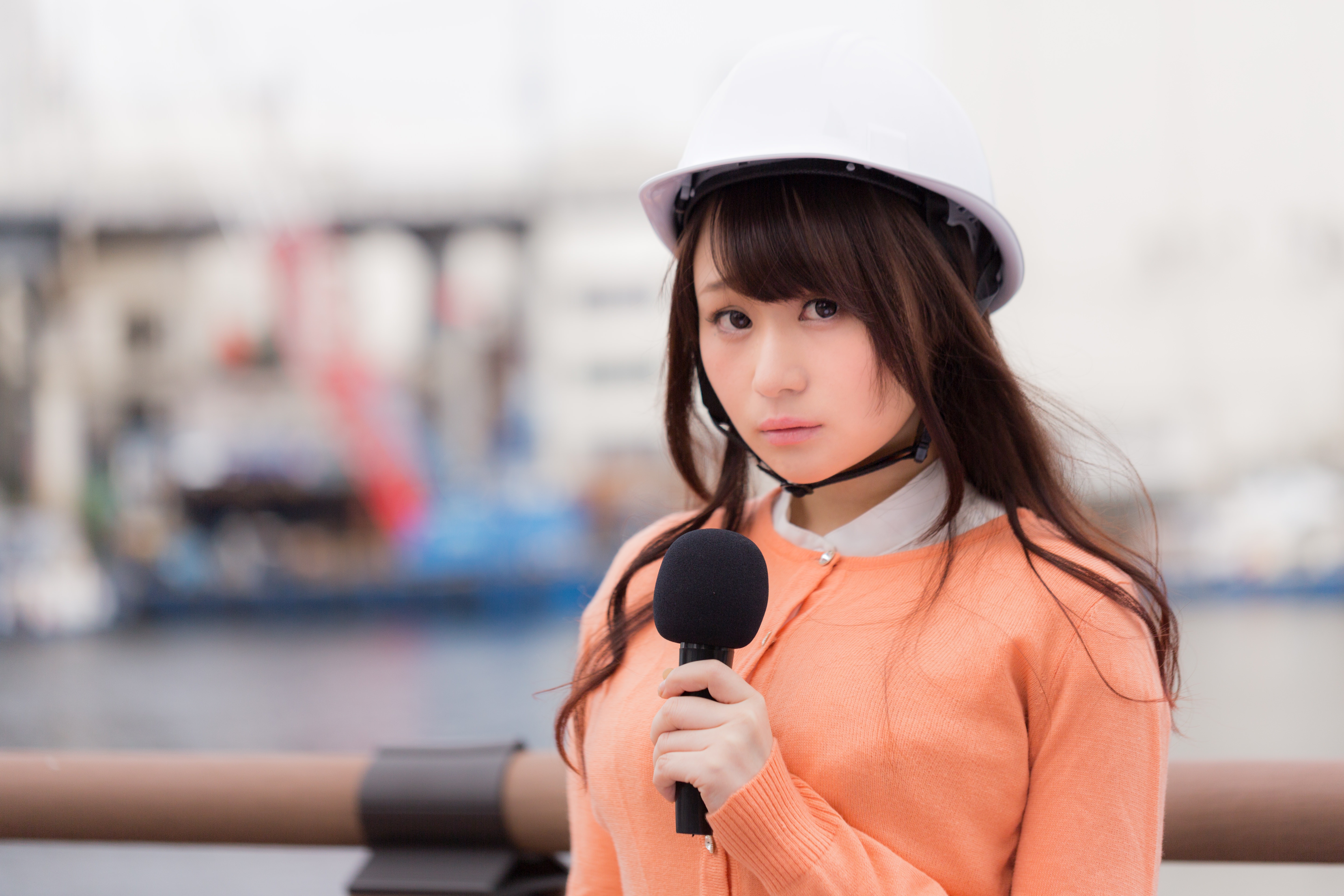 被災地から生中継するアナウンサーの写真素材です。動物の耳飾り付きの帽子とオレンジのセーターを着た女性が、屋外の港近くでマイクを持って立っています。ニュース番組の紹介やレポーター・記者をテーマにしたコンテンツにどうぞ。
