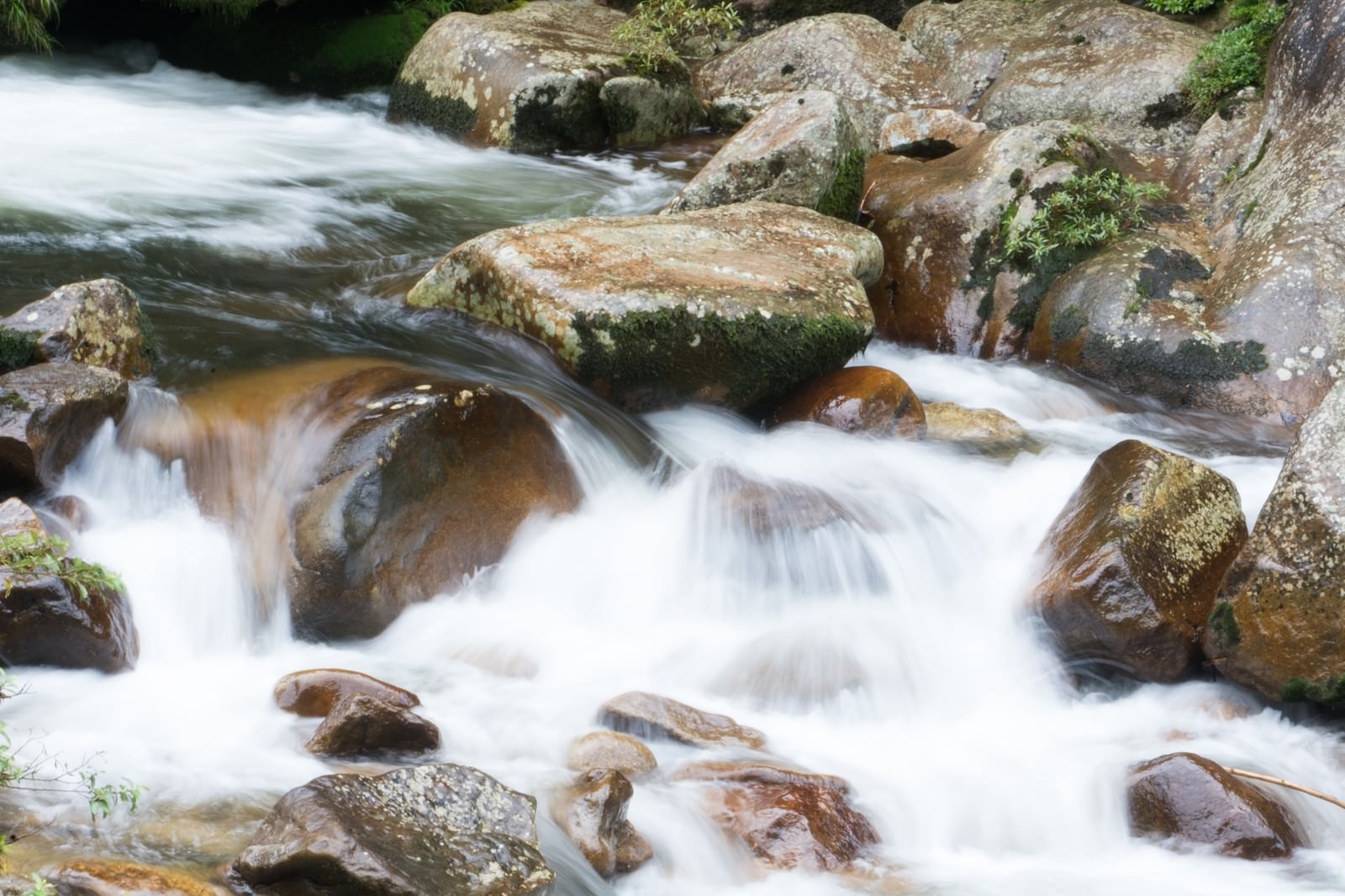 苔むした岩の間を白く流れる渓流の写真素材です。清流が岩をぬって流れ落ち、岩肌には緑の苔が広がっています。自然景観やアウトドア関連のコンテンツにおすすめです。