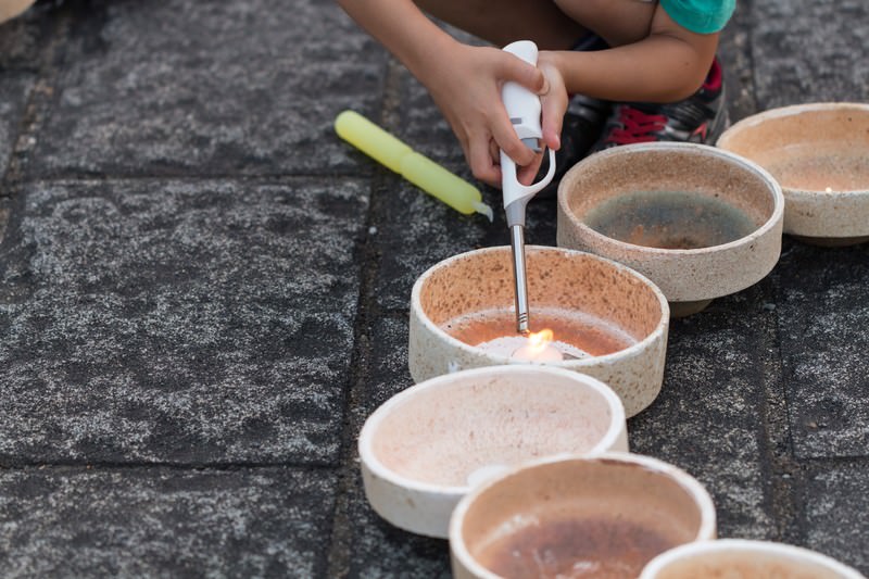 ボシ灯ろうまつりで灯ろうに点火する子どもの手元の写真素材です。石畳の上に並んだ容器に、子どもが筆を使って火をつけようとしています。夏祭りや子ども参加の伝統行事コンテンツにどうぞ。