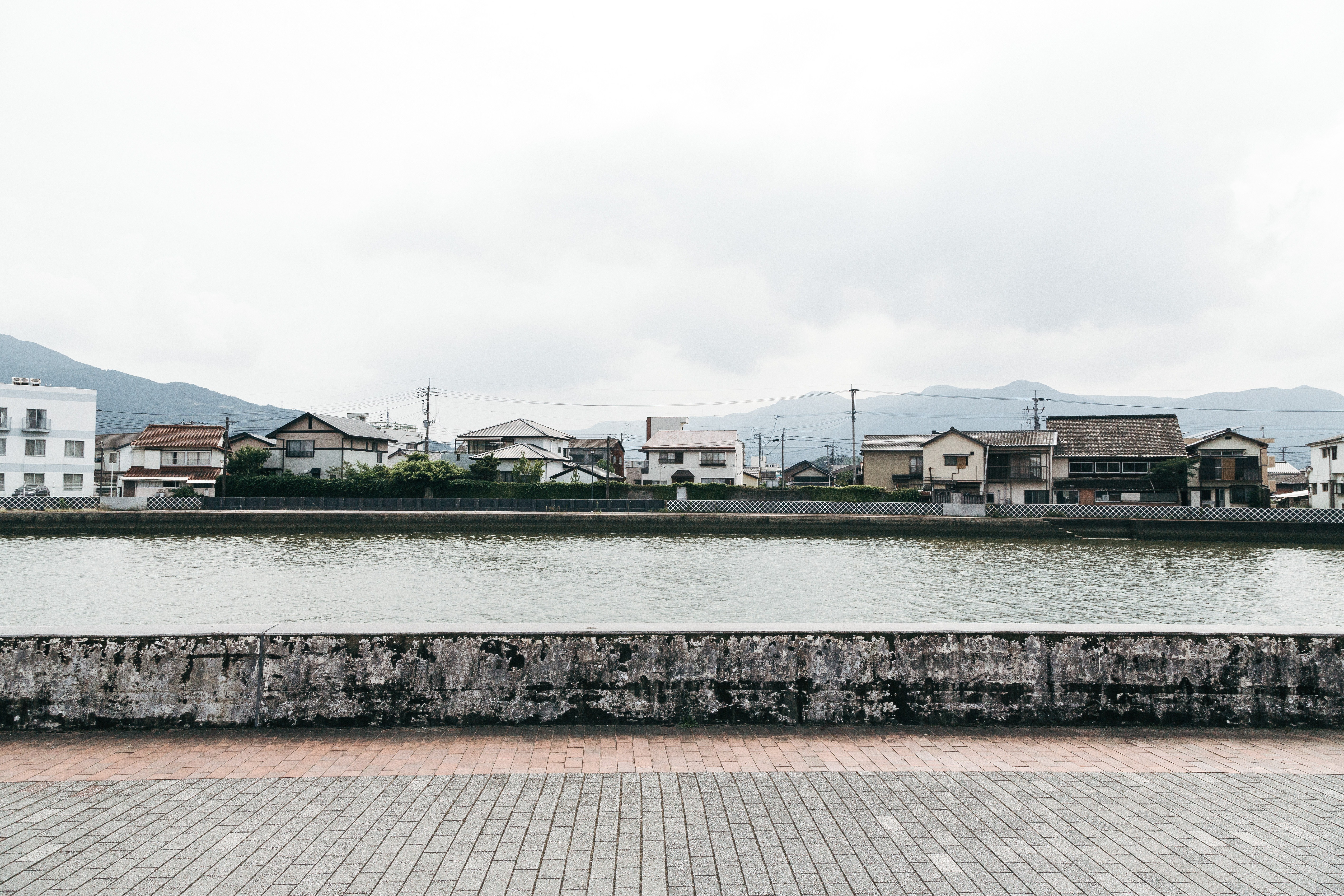 伊万里川の対岸に住宅が並ぶ川沿いの風景の写真素材です。手前のレンガ舗装の遊歩道から水面越しに住宅地を望む構図で、遠くに山も見えます。地方の日常風景や町並み紹介に使えます。