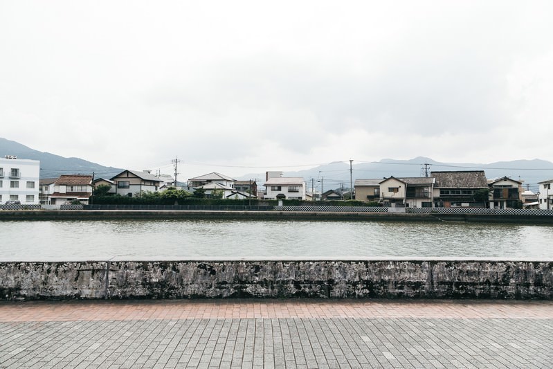 Residential area along the opposite bank of the Imari River and riverside scenery