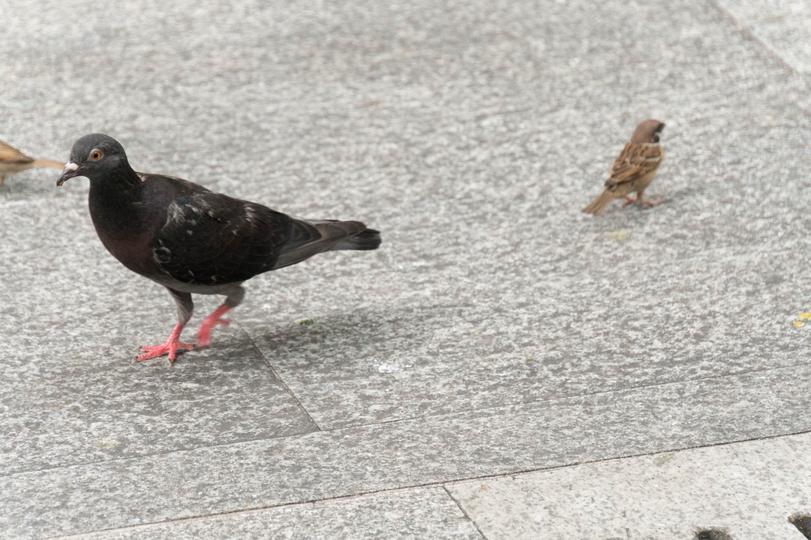 舗装された地面に鳩と雀がいる写真素材です。黒い羽と赤い足が目立つ鳩が手前に、奥には小ぶりな雀が立っています。野鳥観察や都市の日常風景を伝える記事などにご利用いただけます。