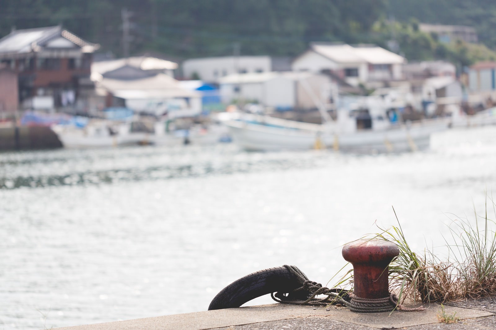 佐賀県伊万里市の波多津港を撮影した写真素材です。手前に錆びた係船柱とロープが写り、背景に建物や船が霞んで見えます。港町の紹介や漁業・地域コンテンツに使えます。
