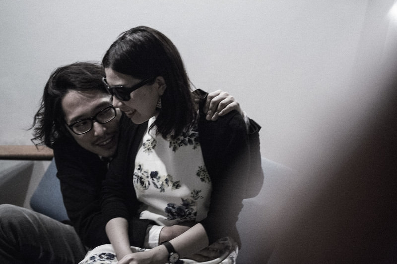 夜の密会で寄り添う男性と女性の写真素材です。黒縁眼鏡の男性と黒いジャケットを着た女性がソファーに座り、女性が男性の肩に腕を回し、薄いグレーの壁を背景に暗めの色調で向き合う二人の親密なシーン。ドラマ・映画の密会場面、ゴシップ記事、恋愛コンテンツなどにおすすめです。