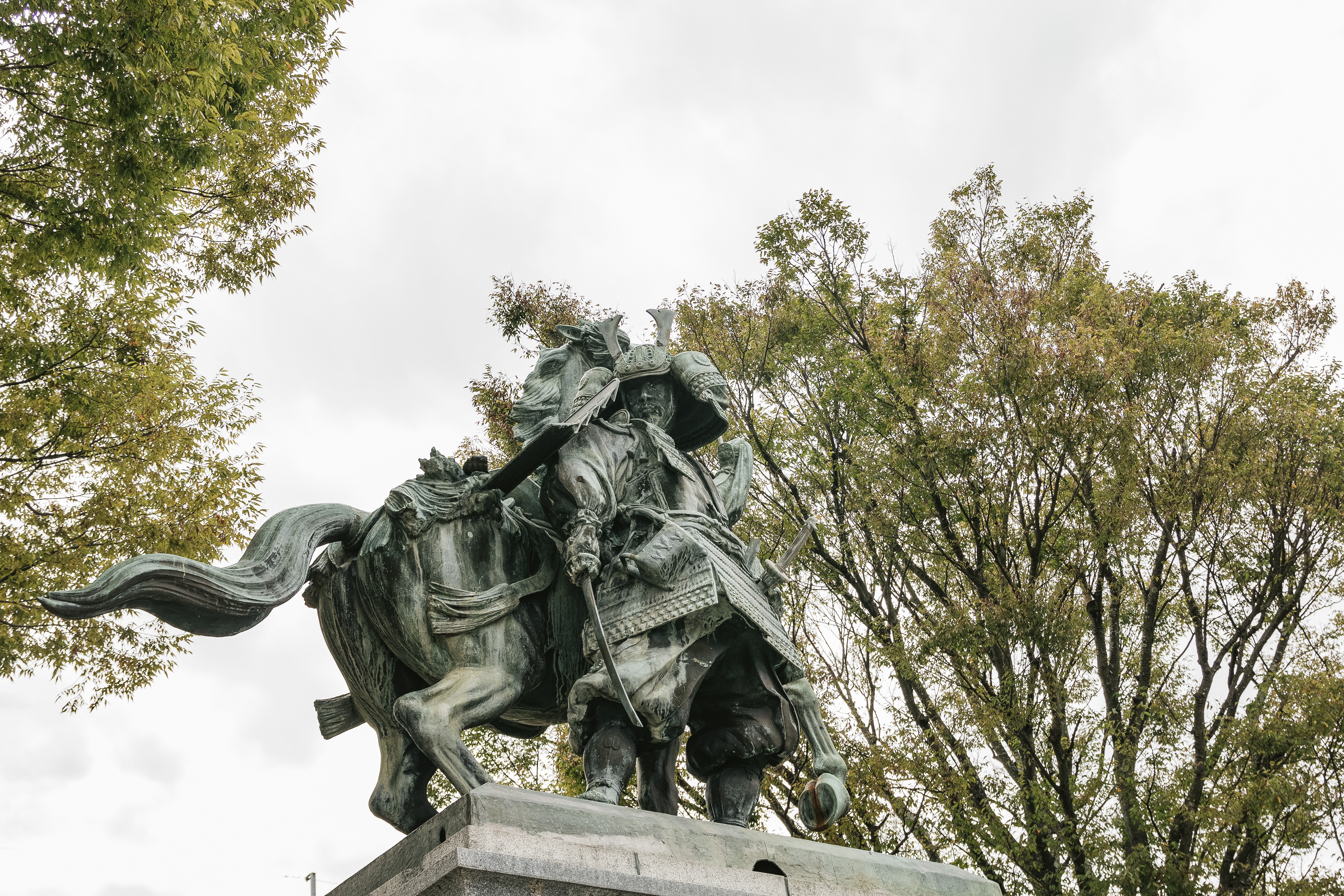 大刀洗公園にある菊池武光像の写真素材です。前足を上げた馬にまたがり、兜と鎧姿の銅像を見上げる構図で撮影されています。福岡の歴史・観光コンテンツや地域紹介に使えます。