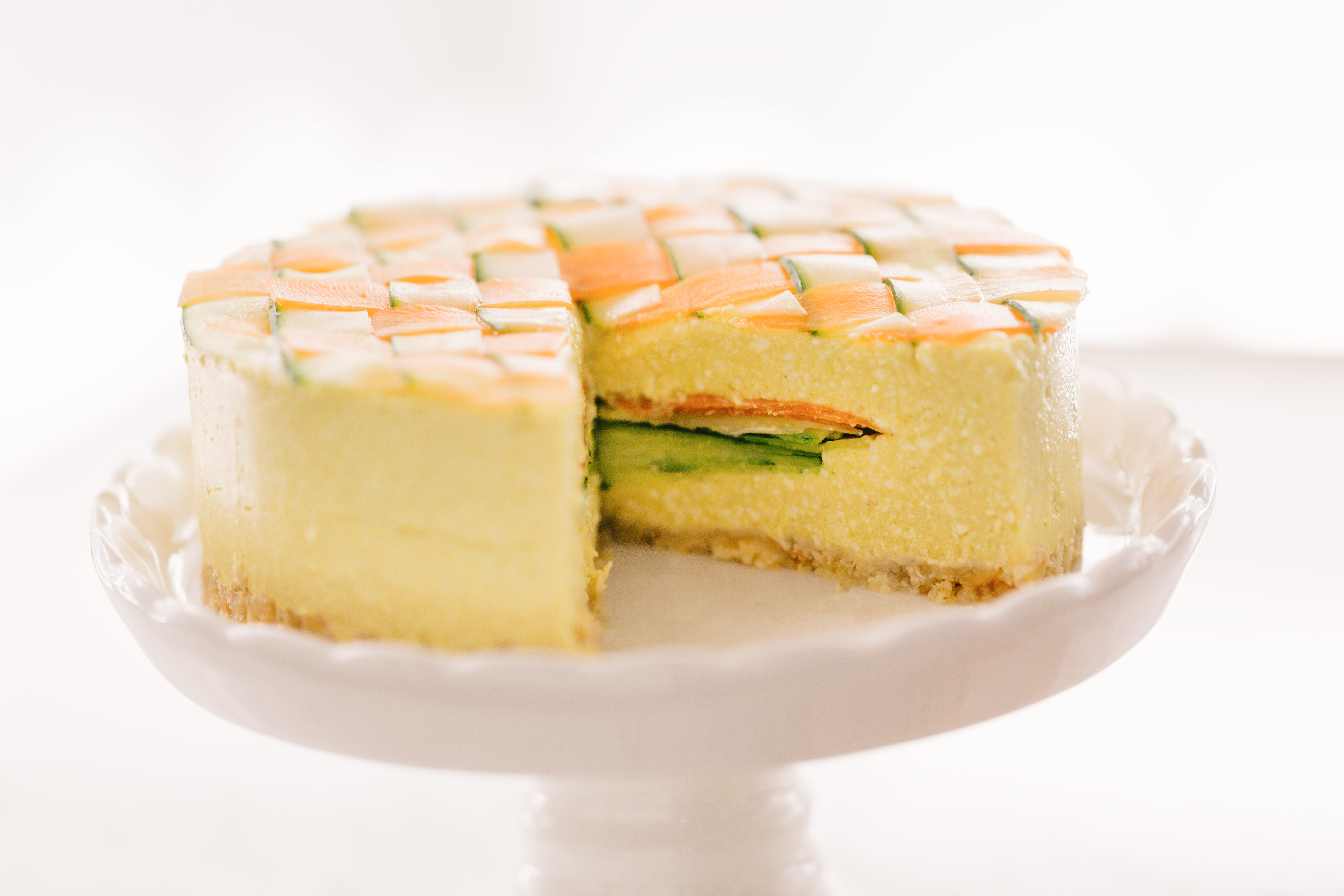 スモークサーモンとチャイブを飾ったベジデコケーキの写真素材です。格子模様の表面と緑の断面が目を引くホールケーキで、一切れがカットされています。健康食やレシピ紹介のブログ、飲食店のメニュー素材などにどうぞ。