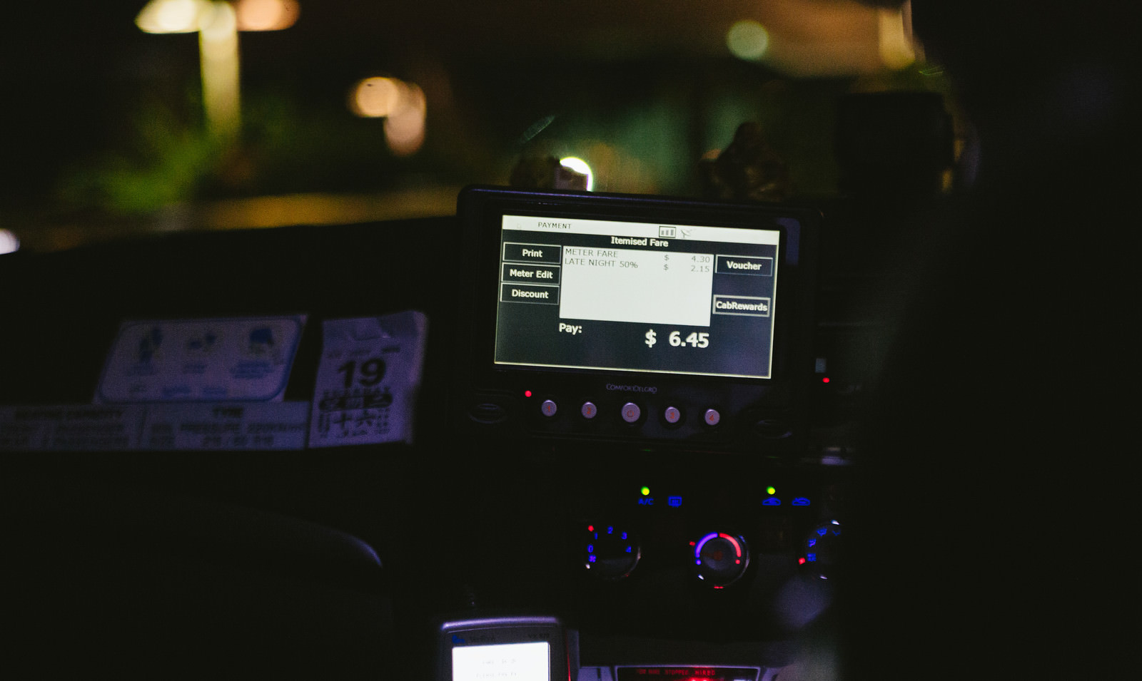 シンガポールのタクシー車内に設置された精算端末の写真素材です。画面に「Pay: $6.45」と運賃が表示されています。海外旅行や都市交通、キャッシュレス決済関連のコンテンツに使えます。