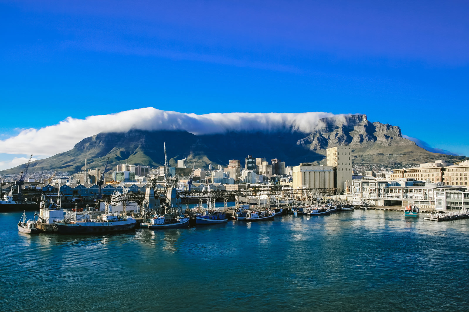 ケープタウンの港に停泊する船と街並みの写真素材です。背後にはテーブルマウンテンの平らな山頂が広がっています。観光地の紹介や旅行パンフレットなどに使えます。