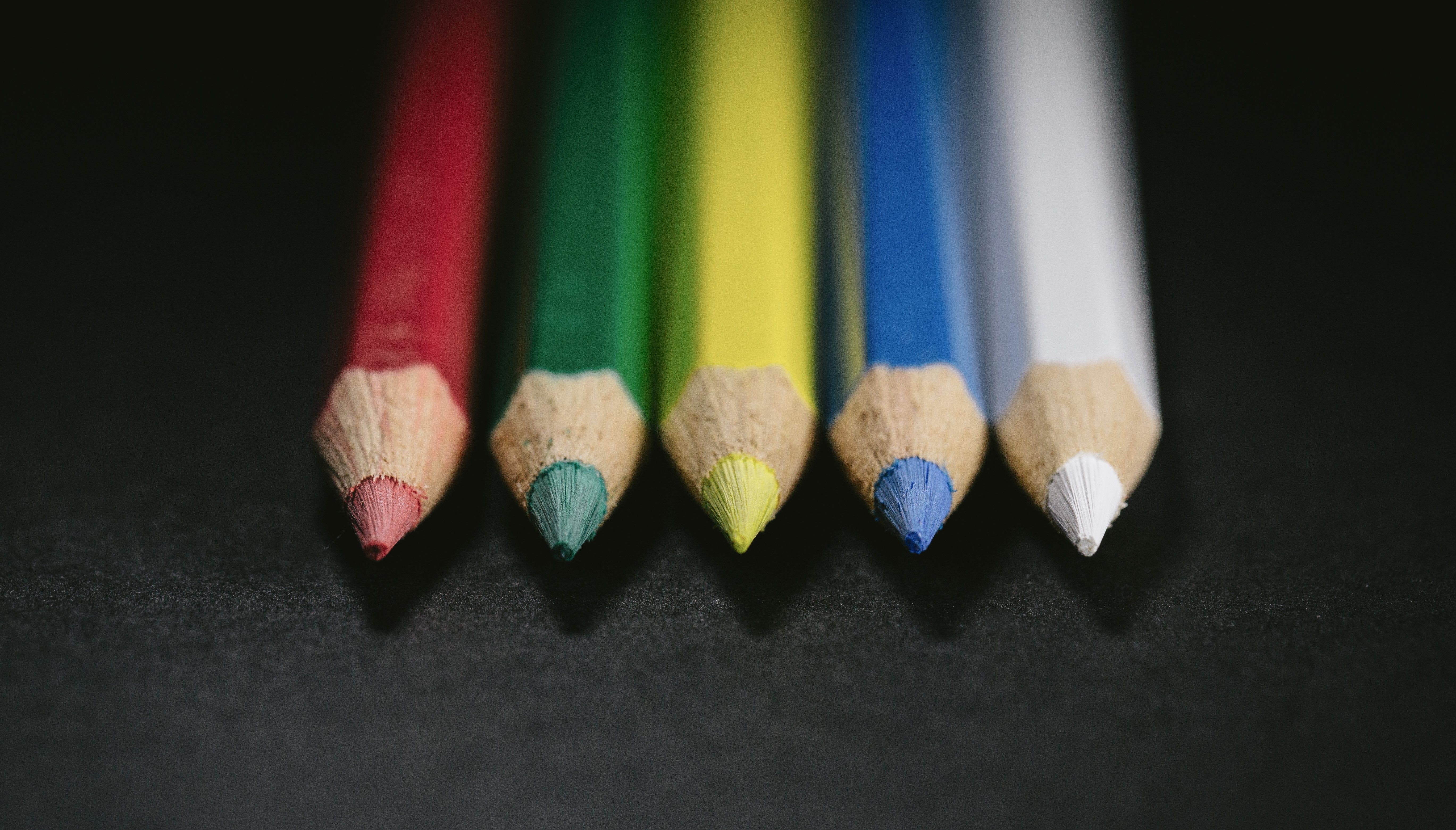 5本の色鉛筆を一列に並べた写真素材です。先端を揃えて黒い背景に置かれています。グループ解散やメンバー分散をイメージした創作コンテンツに使えます。