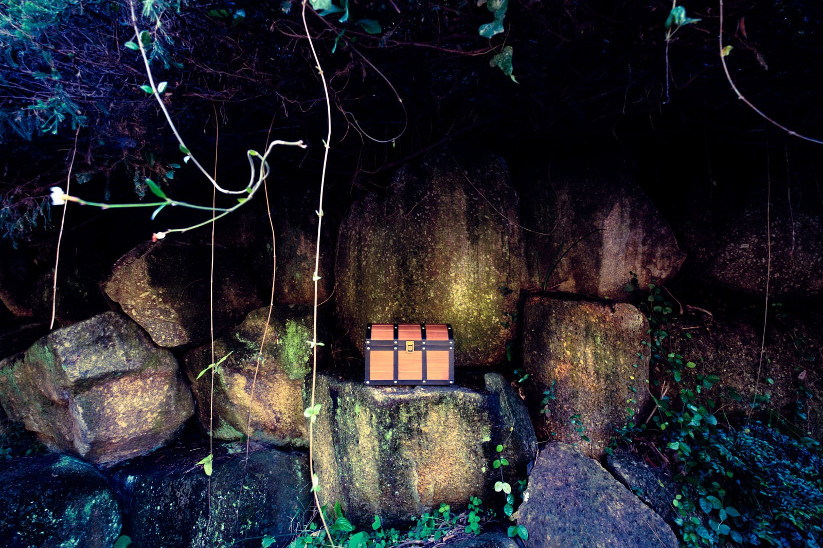 苔むした石積みの前に置かれた古い宝箱の写真素材です。暗い洞窟のような場所で、天井からつるが垂れ、岩は苔に覆われています。ゲームやファンタジー系コンテンツ、謎解きイベントのビジュアルにどうぞ。