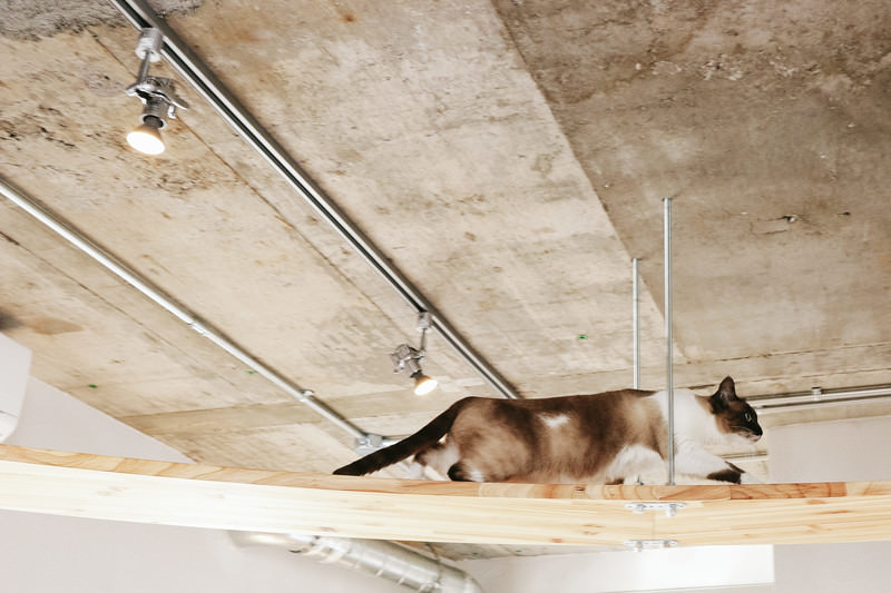 木製キャットウォークを歩く猫の写真素材です。茶白の猫が天井近くの板の上を横切っていく場面で、コンクリート天井とスポットライトが背景に見えます。猫のいる暮らしやペット関連のコンテンツに使えます。