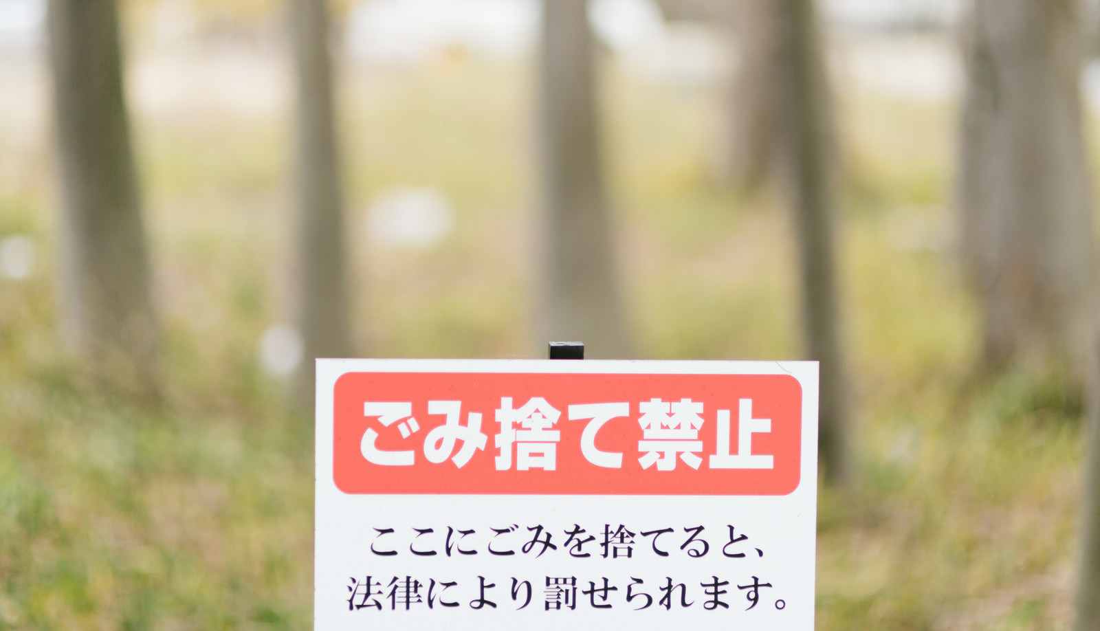 ごみ捨て禁止を呼びかける赤い警告看板の写真素材です。「ごみ捨て禁止」の文字と法的罰則の説明が記載されています。環境問題の啓発や公共ルール関連のコンテンツに使えます。