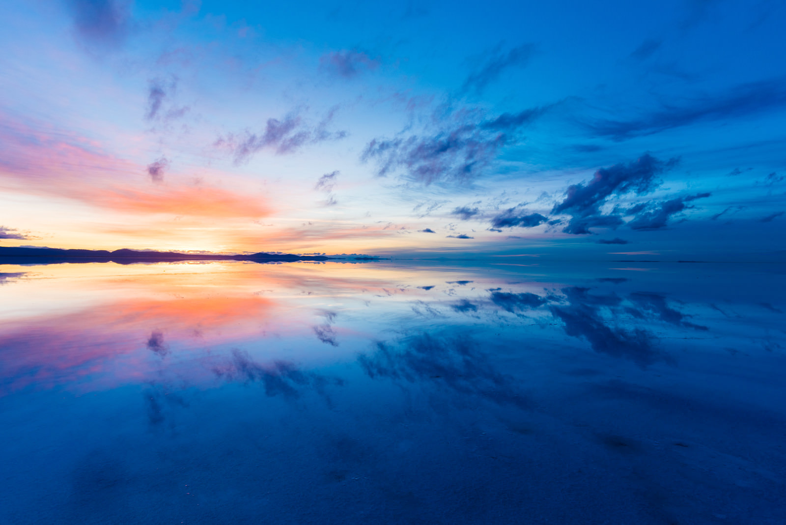 Sunset and gradient sky reflected like a mirror on Uyuni Salt Flat