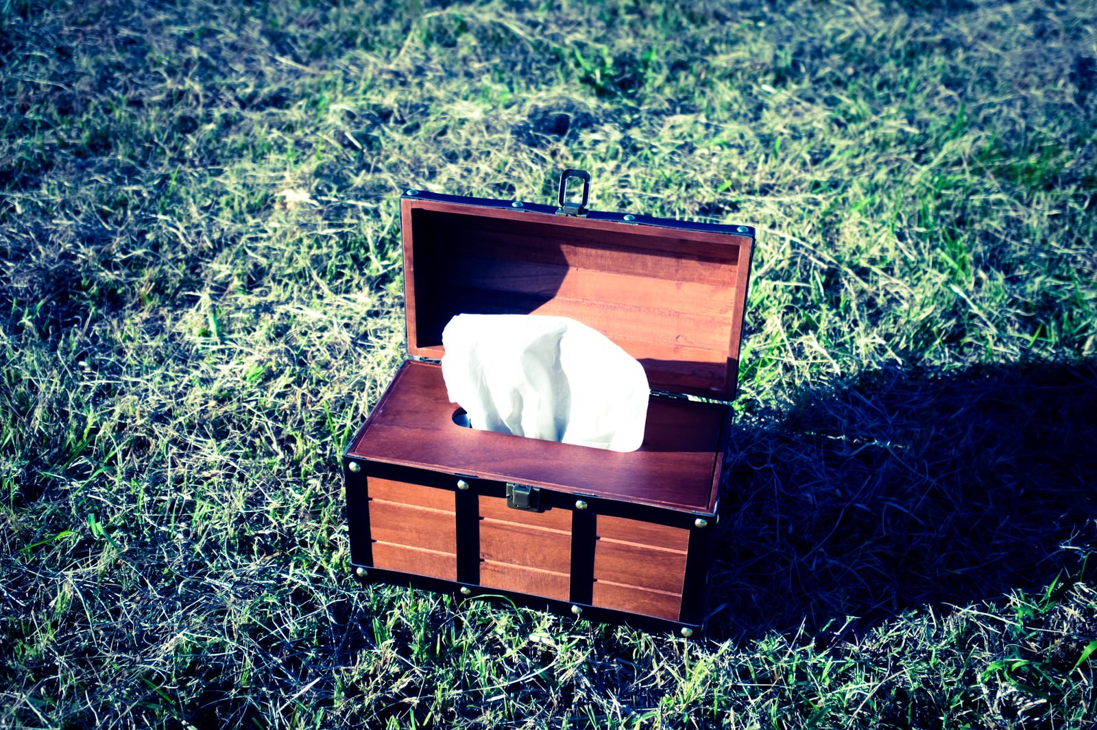 ヴィレッジヴァンガードで販売されているティッシュケース型の宝箱の写真素材です。茶色い木製のトランクケースに白いティッシュが詰まっており、蓋が開いた状態で緑色の草地の上に置かれています。グッズ紹介やユニーク雑貨の販売促進、RPGゲーム関連のコンテンツなどにおすすめです。