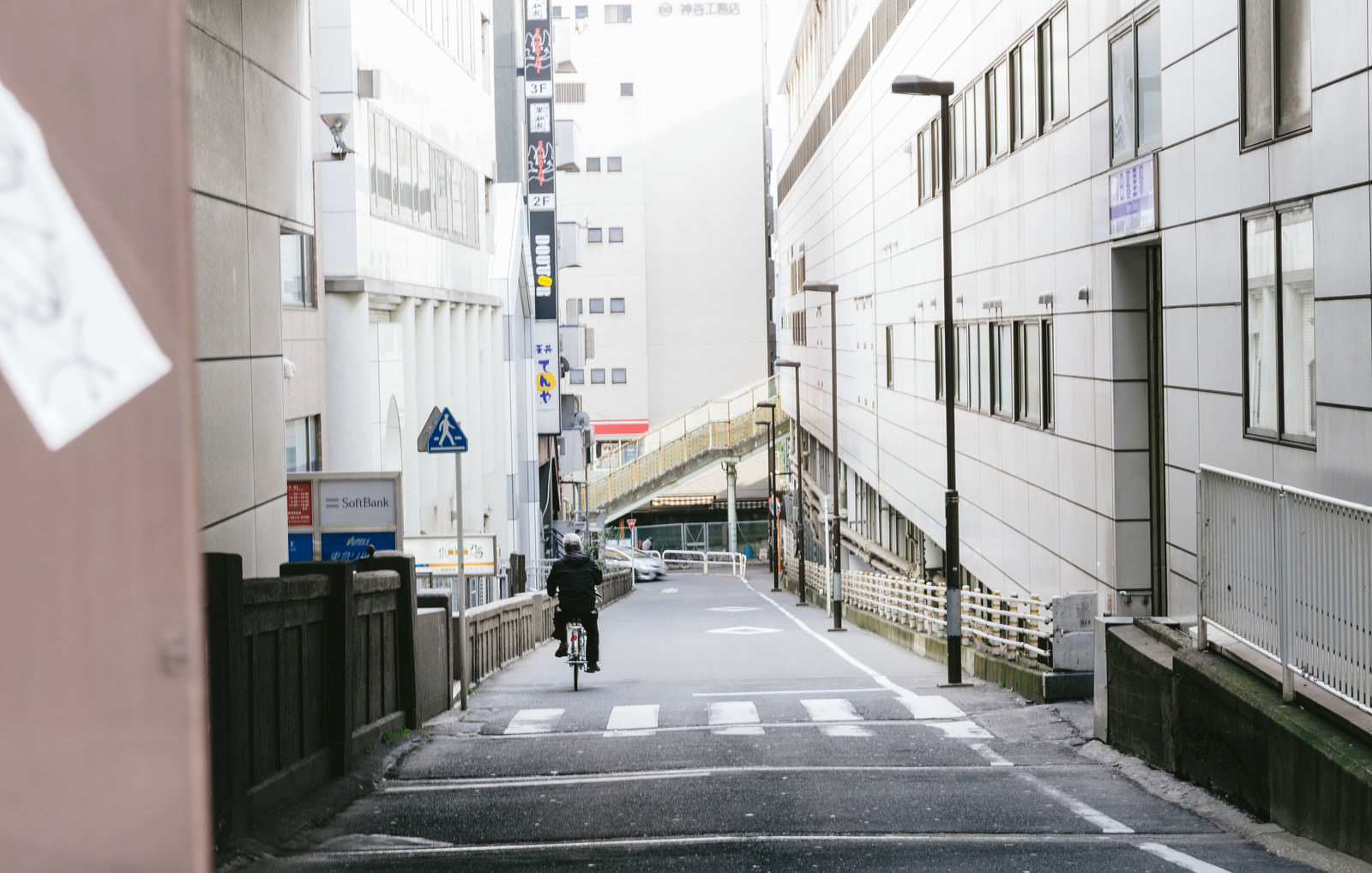 日暮里駅東口を出た坂道の写真素材です。両側に白い建物が並ぶ狭い坂道を、自転車に乗った人物が走り抜けています。都市の日常風景や交通シーンの素材におすすめです。