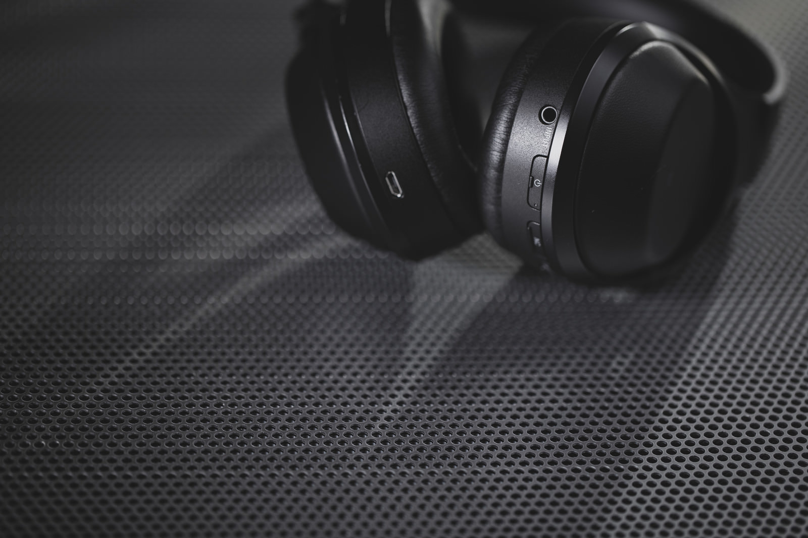 黒いワイヤレスヘッドフォンが置かれた静物のフリー写真素材