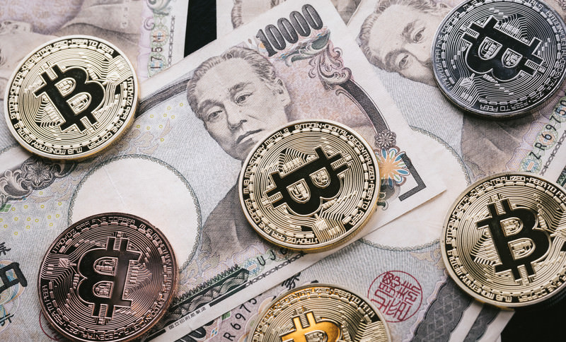 ビットコインのコインと一万円札を撮影した写真素材です。金色・銀色・銅色のビットコインコインが一万円札の上に並んでいます。仮想通貨と法定通貨の対比を示したい記事やコンテンツに使えます。