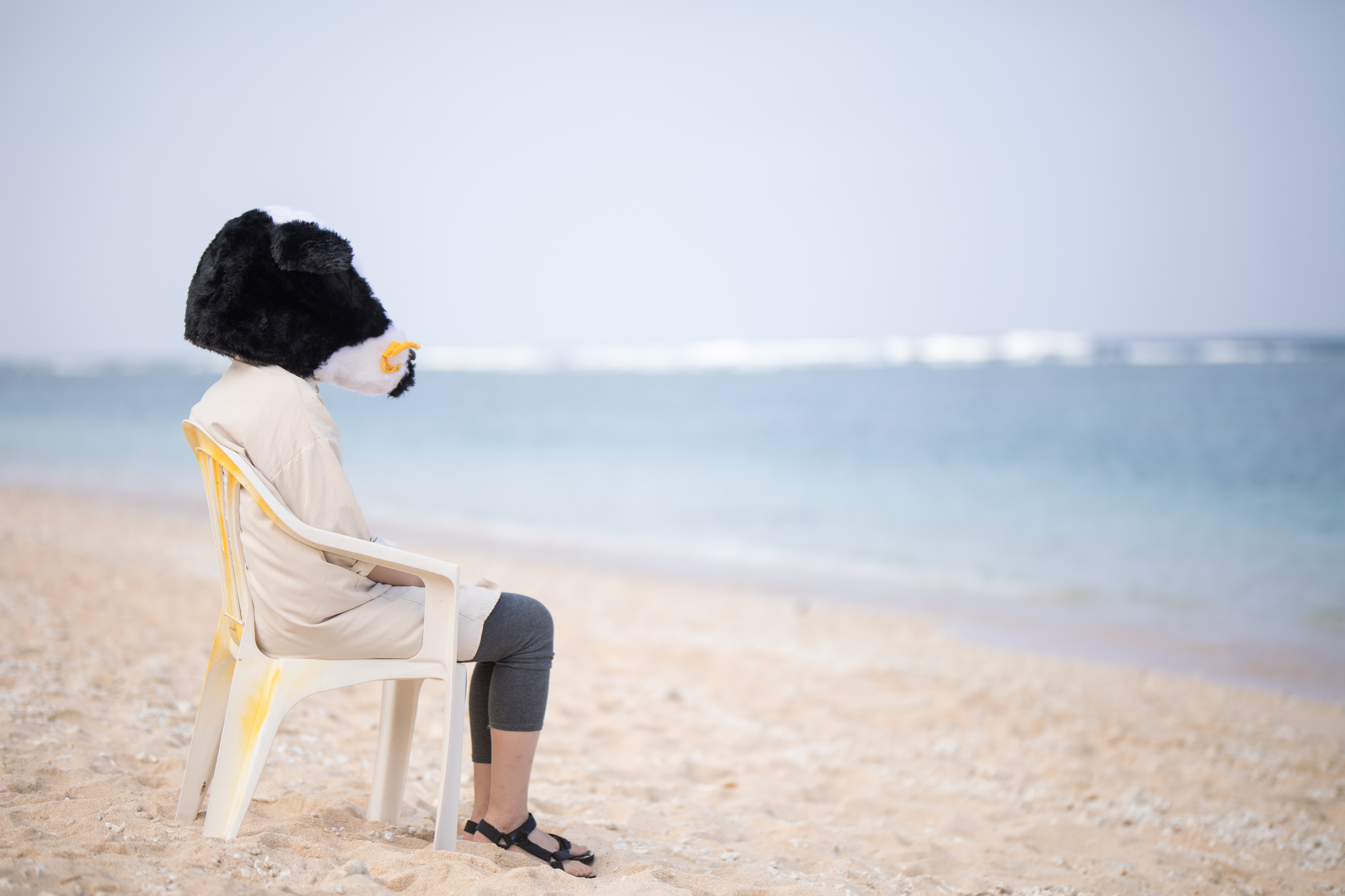 宮古島の海を見つめる牛の着ぐるみを着た人の写真素材です。青い海と白い砂浜を背景に、黄色い椅子に座り、黒い牛の着ぐるみを着た人が水平線を向いて静かに佇んでいます。失恋後の心情表現や罰ゲーム、寂しさを表現したいシーン、ユニークな旅の思い出など、様々な場面での活用におすすめです。