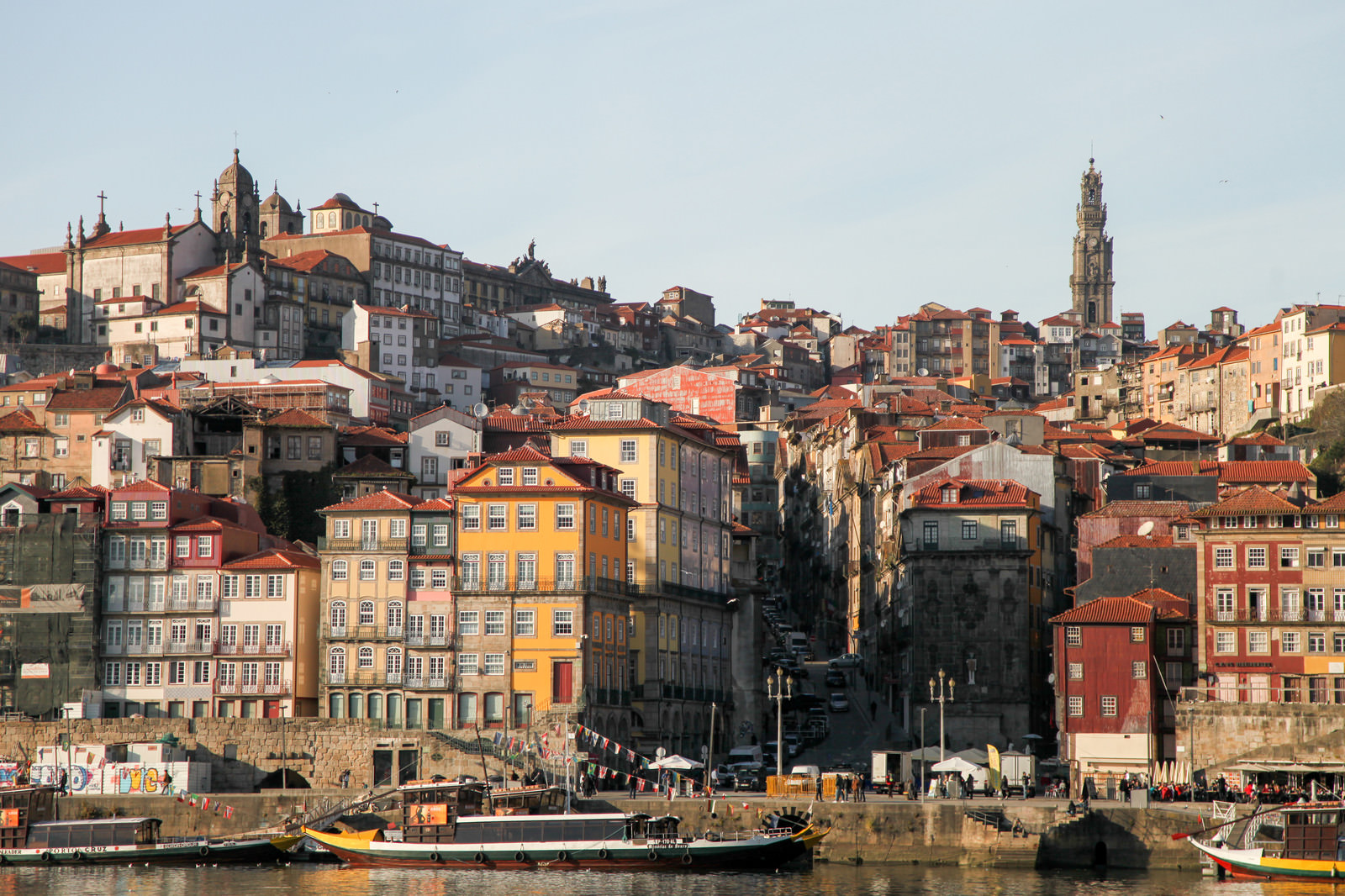 ポルトガル・ポルトのドウロ川沿いに建つ街並みの写真素材です。オレンジや黄色の外壁が並ぶ建物群が丘の斜面に重なり、川には小型ボートが停泊しています。旅行・観光や世界遺産関連のコンテンツ素材として使えます。