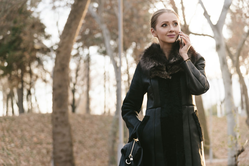 待ち合わせ場所からスマホで電話する女性の写真素材です。黒いコートを着たモデルがスマートフォンを耳に当てて通話しており、待ち合わせシーンや日常コミュニケーション、ビジネス連絡関連のコンテンツ制作におすすめです。